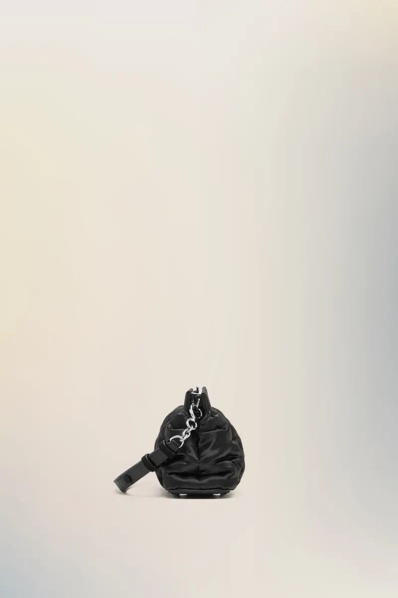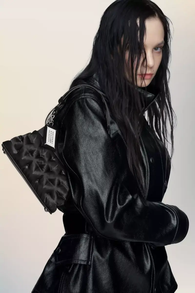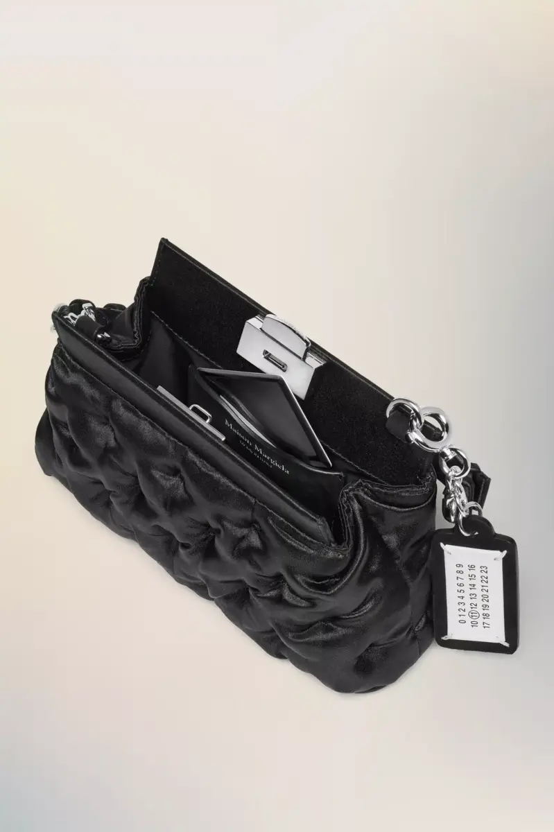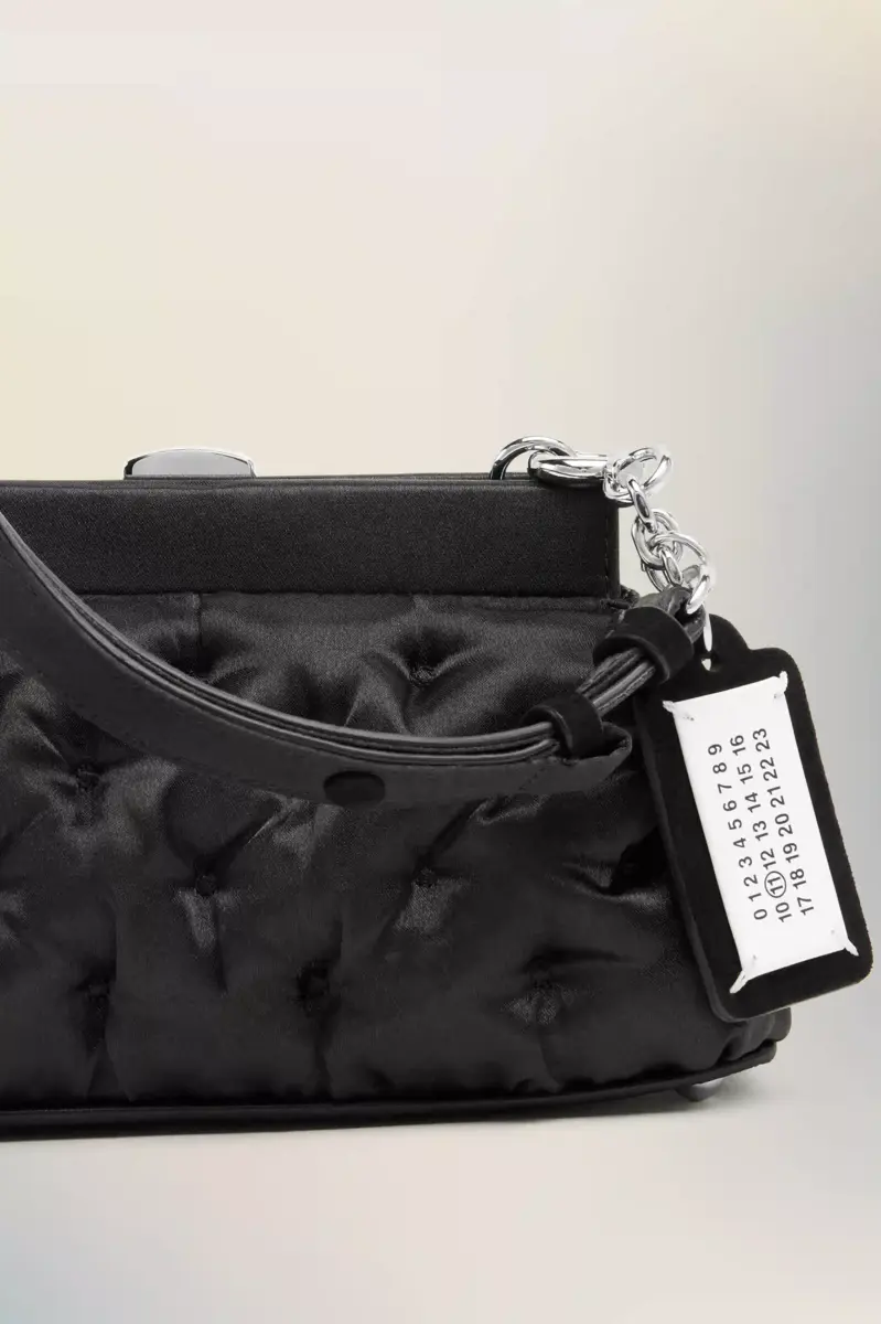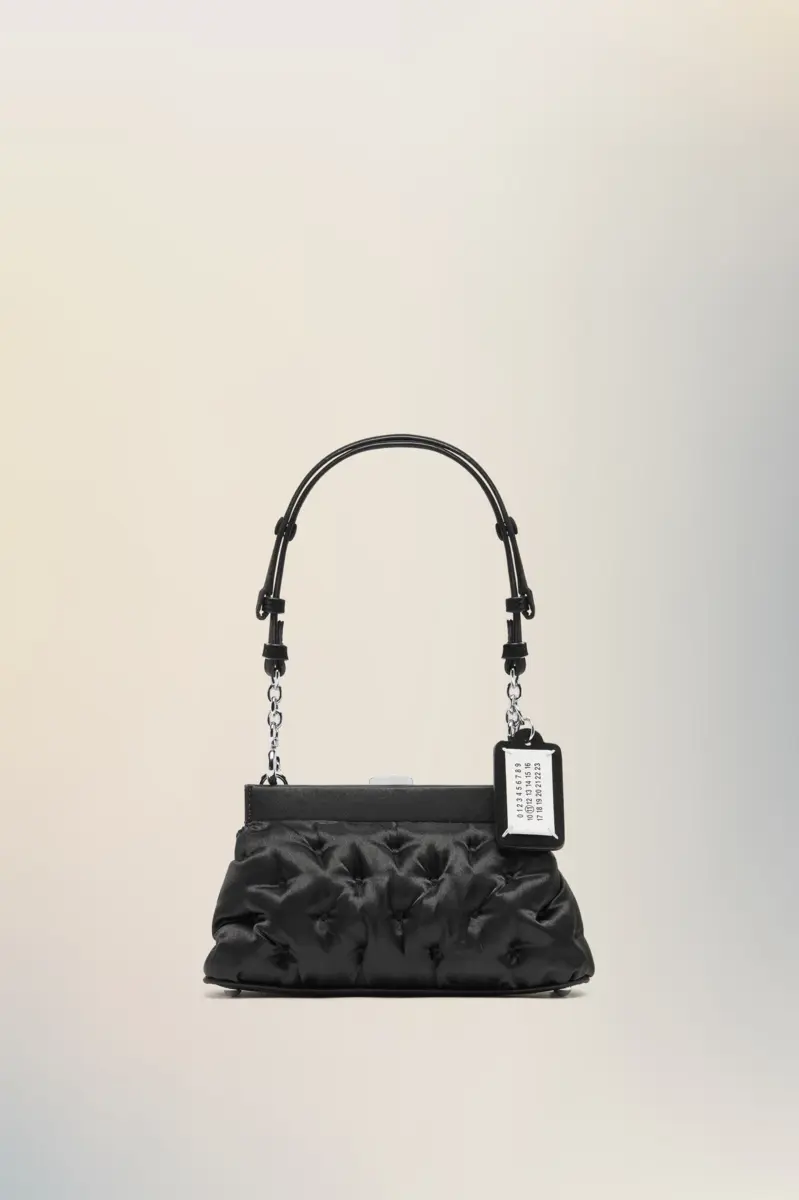 The Glam Slam evening bag reimagines the Maison’s signature padded shape in delicate satin. Silver-tone hardware lends a graphic edge, while the soft body stays true to the tactile language of matelassé quilting. Worn by hand or on the shoulder, it reflects unconscious glamour through contrast and craftsmanship.