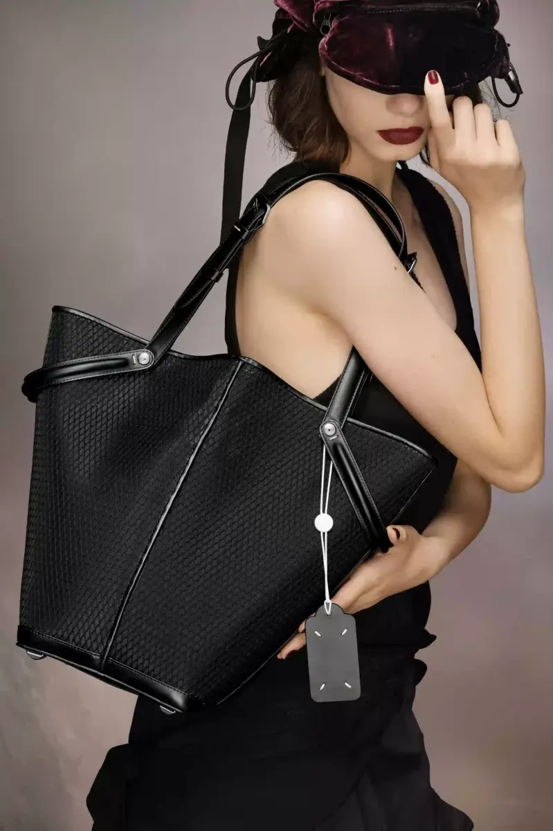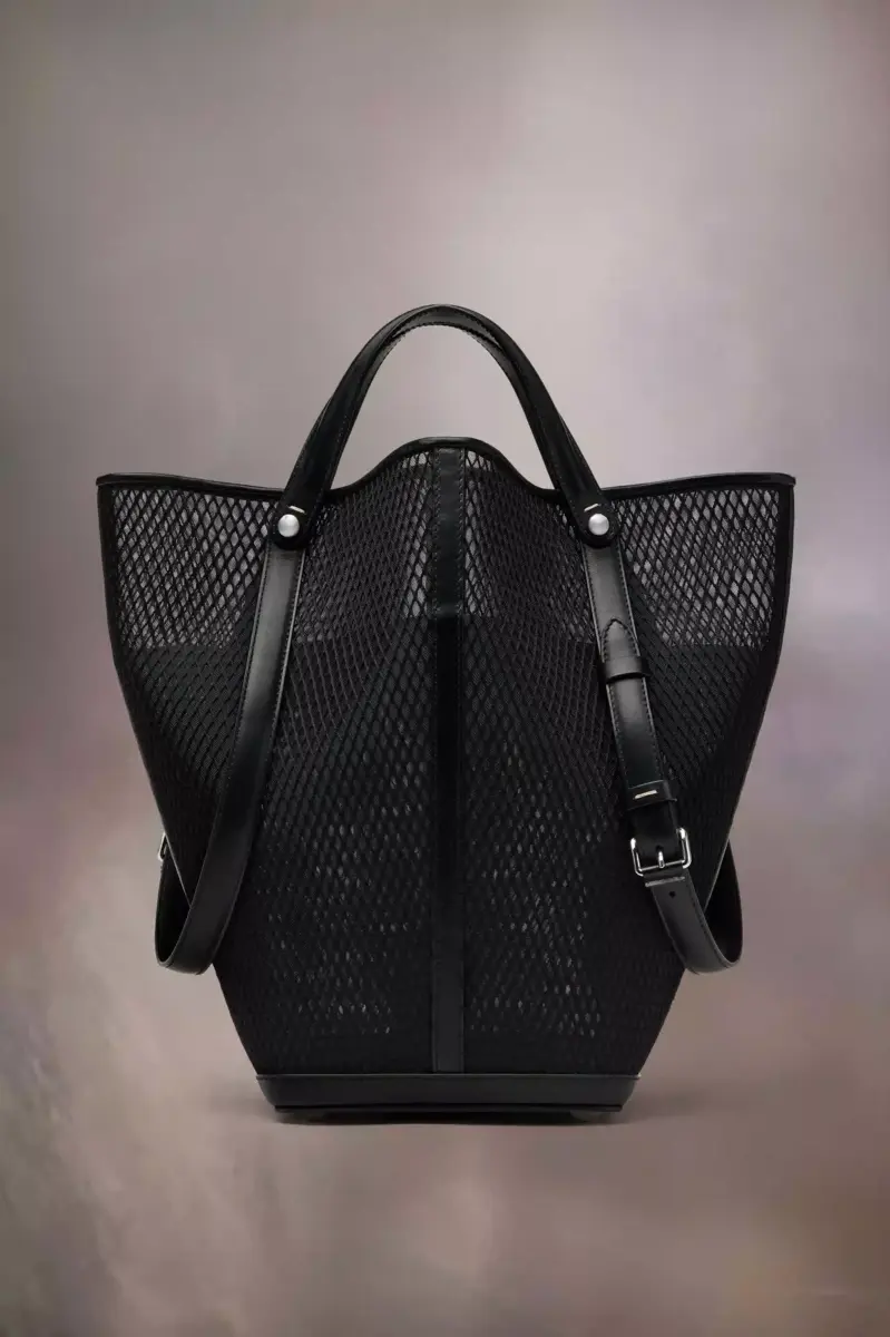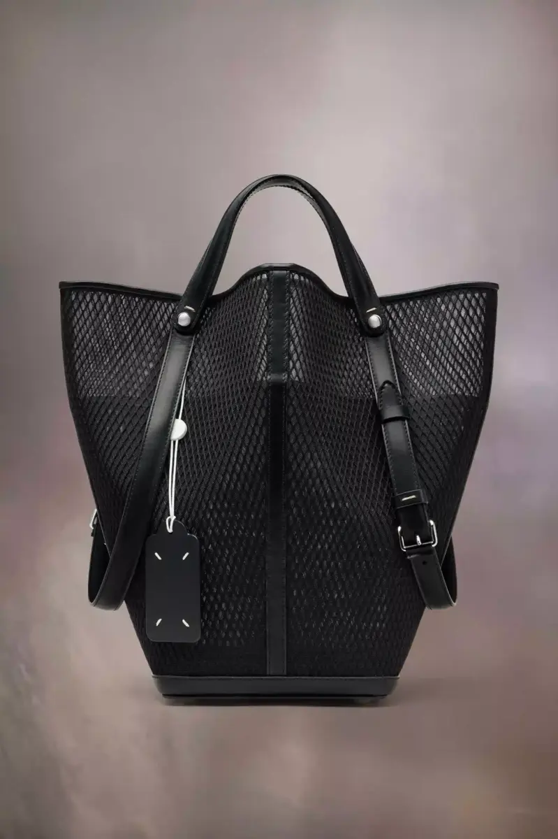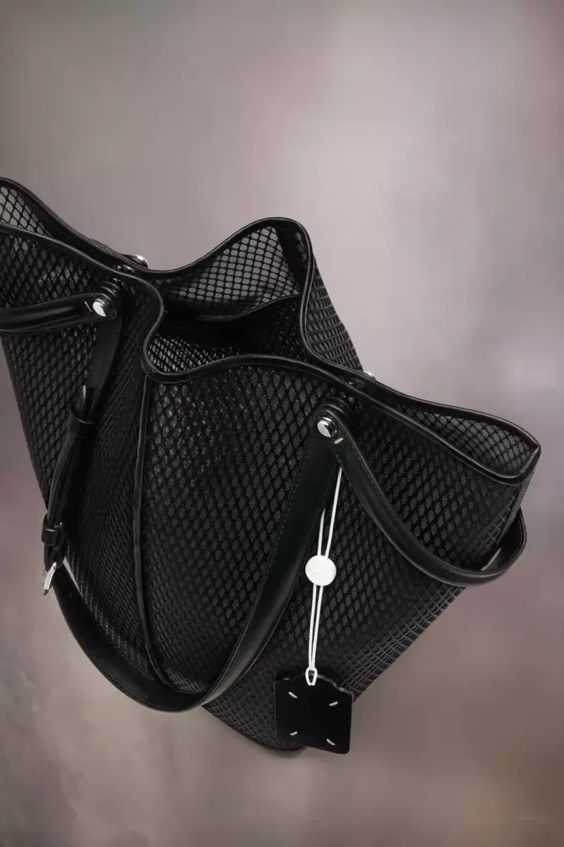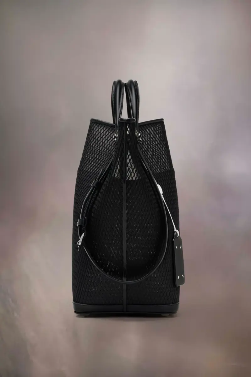 The Maison launches the Dress-age handbag for SS25, crafted from calf leather with a net overlay. With an equestrian spin, the medium handbag is inspired by the regalities of dressage horse riding. It follows a trapezoid design with short strap detail, which can be worn as top handles or pushed down to mimic stirrups with the longer, adjustable buckled straps worn over the shoulder. The base is studded, allowing the bag to stand, and the inner is accented with the logo. It features a logo identity tag with contrast string. Maison Margiela’s signature, the four stitches, appear at the side; the opposite of a label.