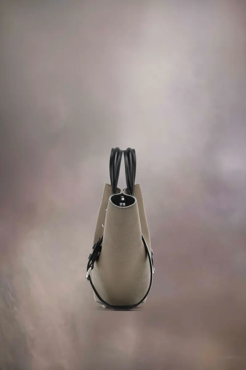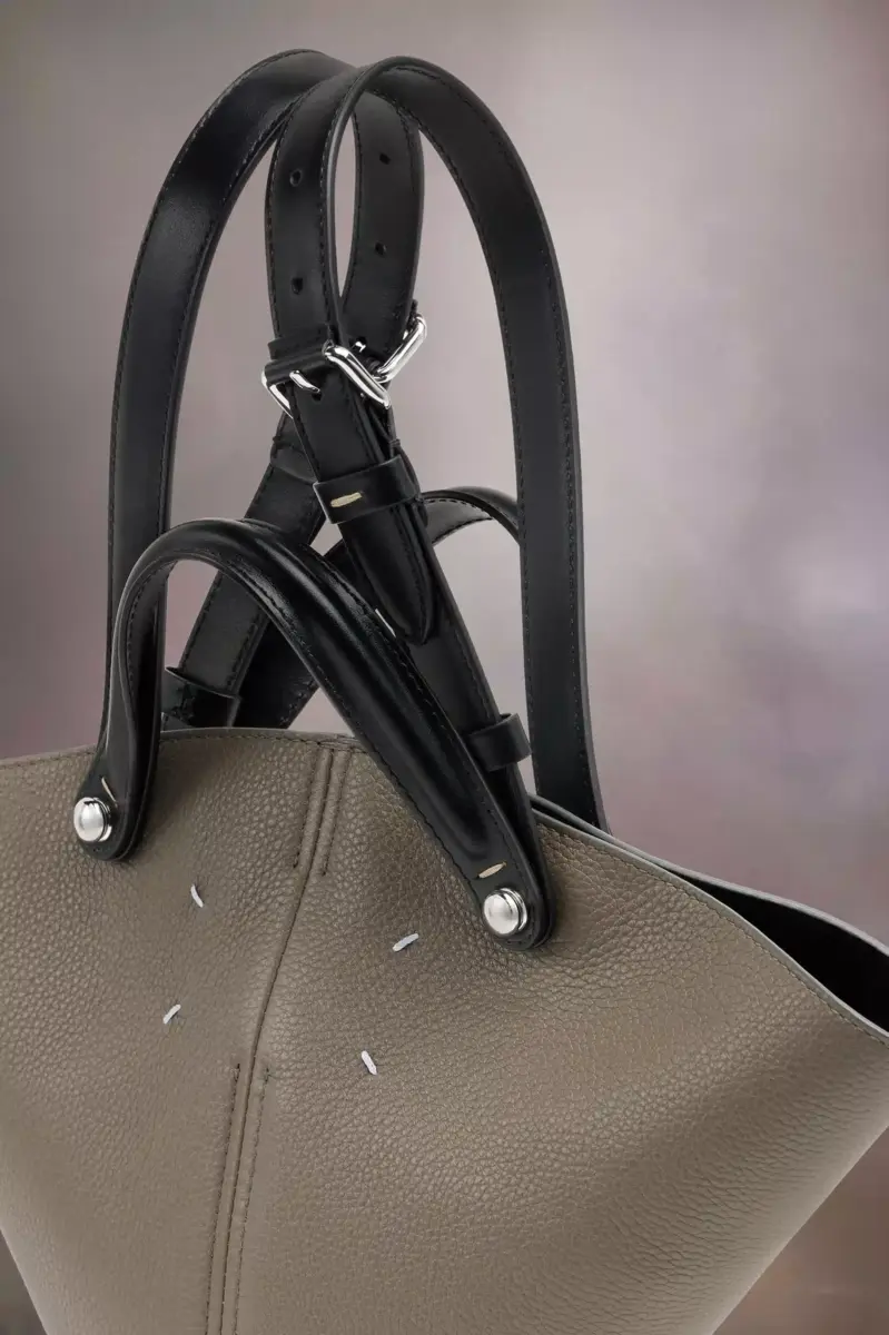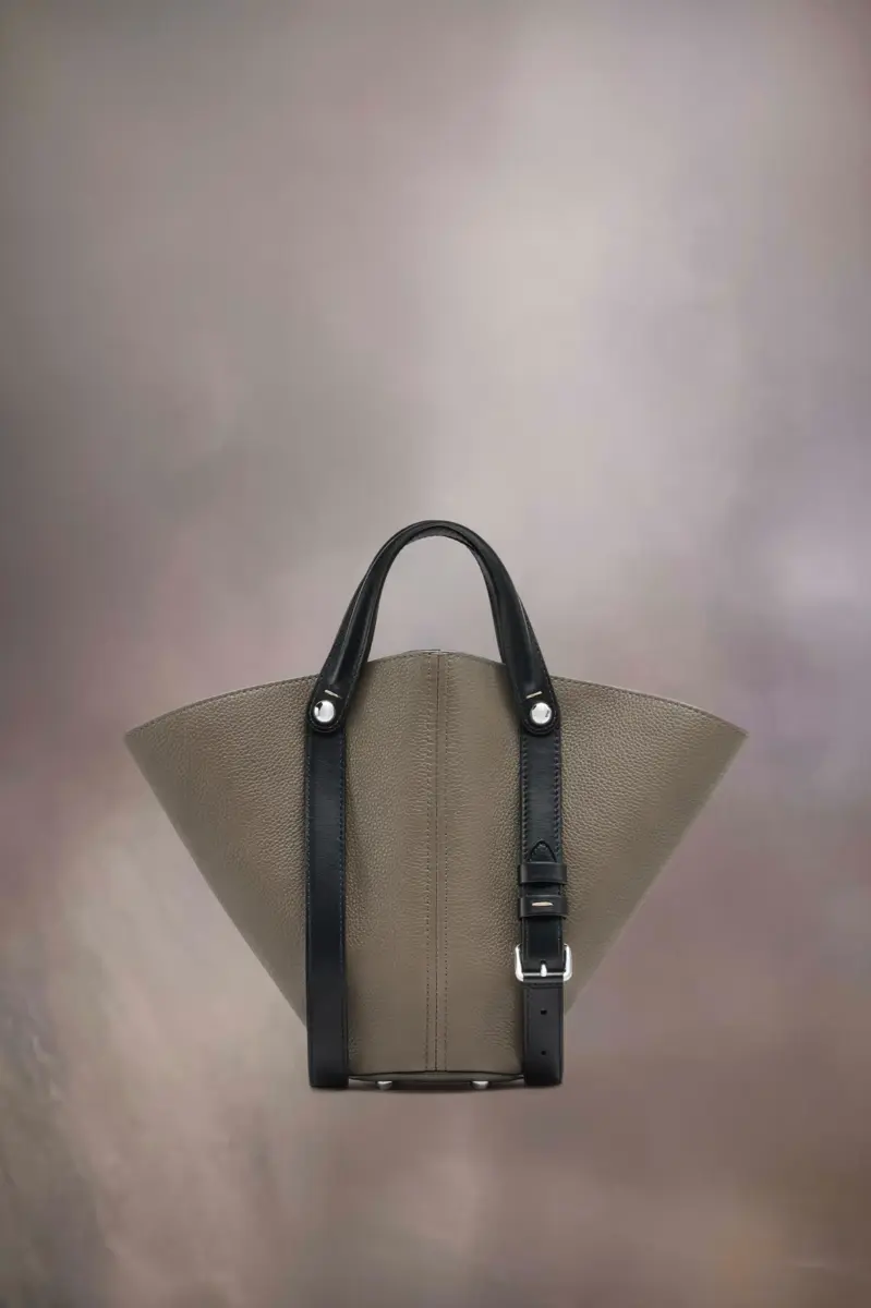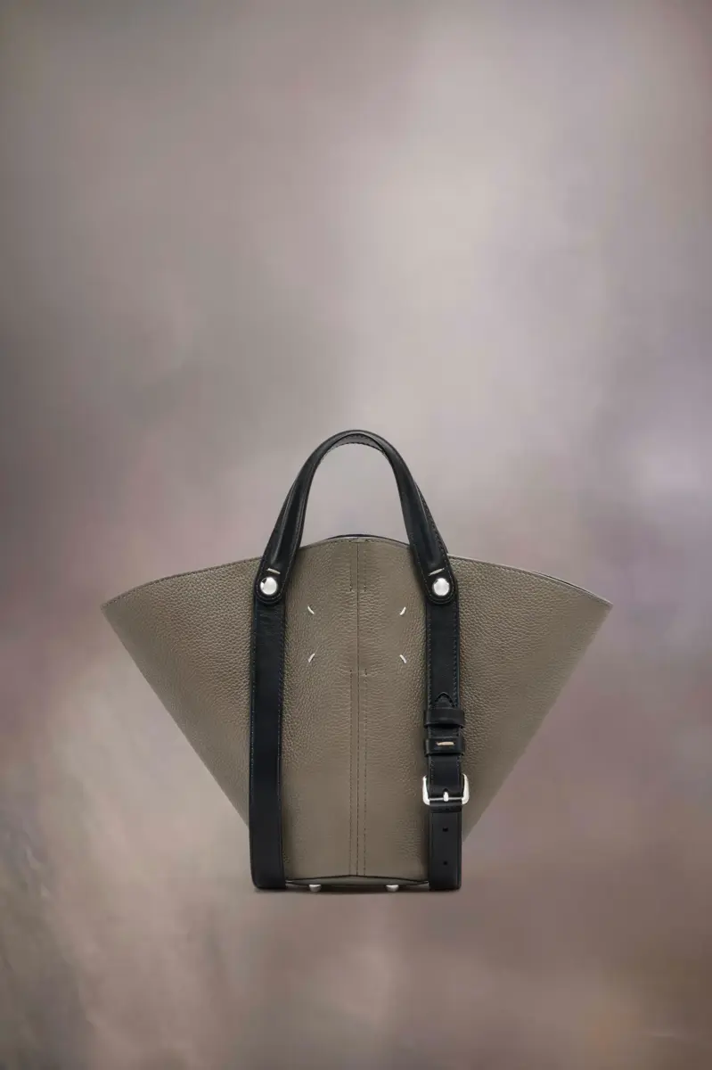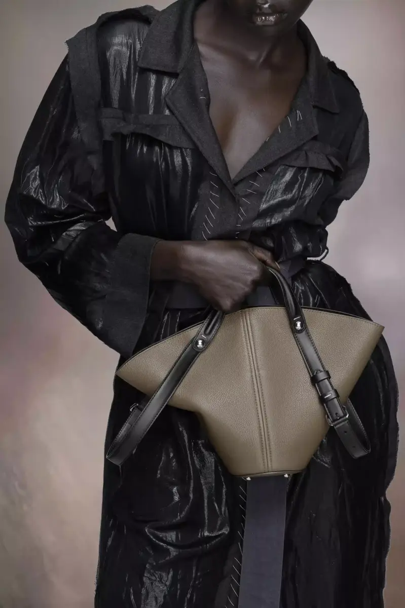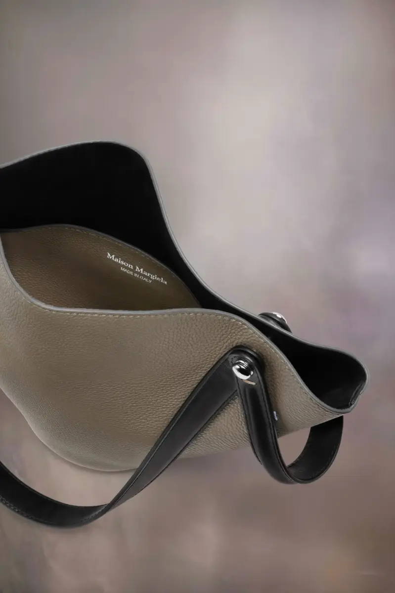 The Maison launches the Dress-age handbag for SS25, crafted from soft pebbled calfskin. With an equestrian spin, the small handbag features classic leatherwork and refined lines, combining unconscious glamour with gestural design. It follows a conical shape with contrast dual-wear strap detail. The studded base allows the bag to stand, and the inner is adorned with the logo. Maison Margiela’s signature, the four stitches, appear at the back; the opposite of a label.