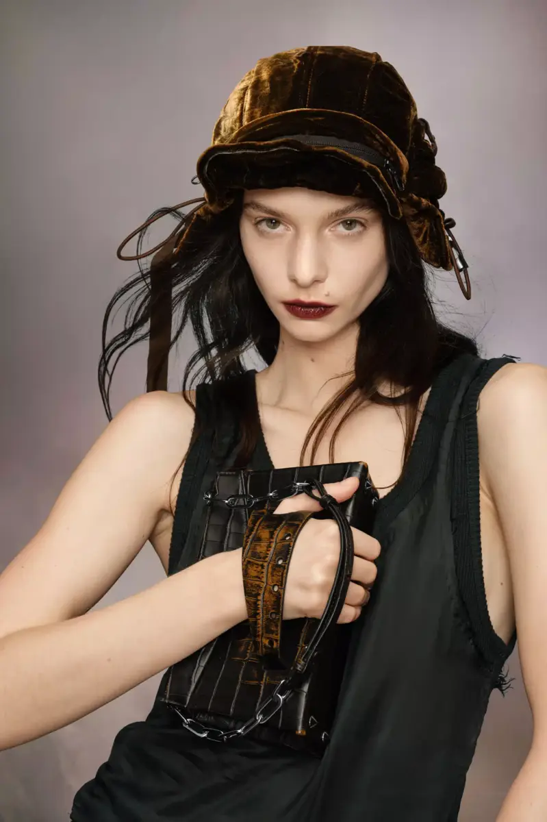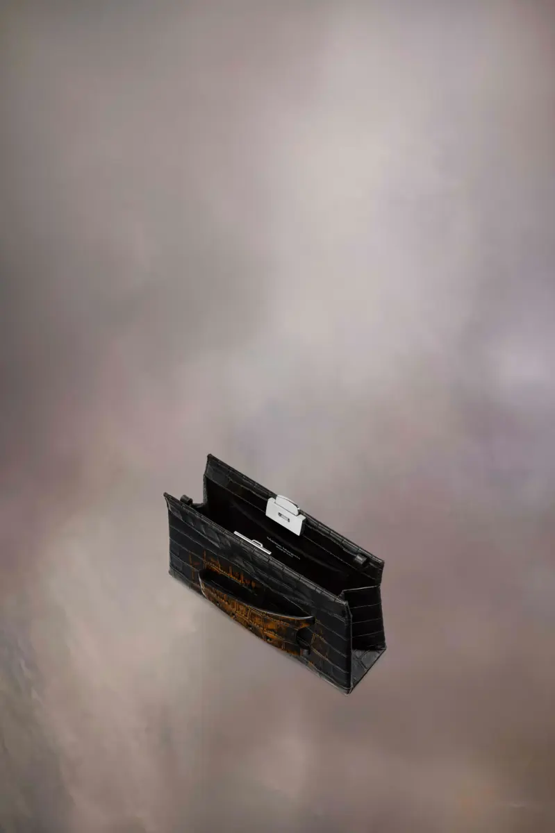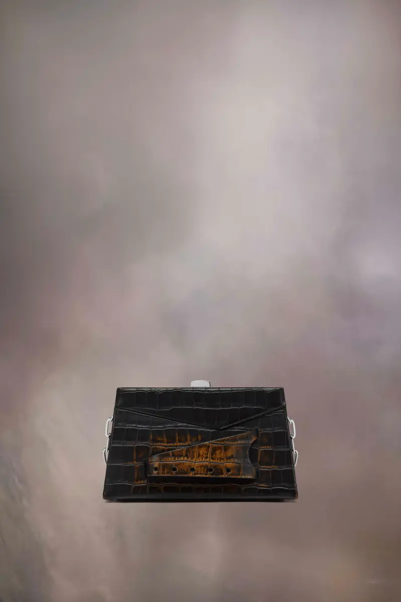 The small Snatched shoulder bag clutch is crafted from croc print leather with contrast colour to the front. The Snatched debuted in the AW19 Artisanal Collection. It lends its name from the colloquial term for ‘good looks’, and also the way it can be held in a snatching manner. The genderless bag presents an asymmetric shape, inspired by origami. It features a chain strap, and a perforated front handle to be worn as a clutch.