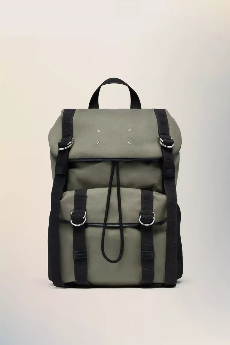 This technical backpack is designed with a structured flap top, dual front straps, and side mesh pockets for breathable utility. A drawstring fastening secures the main compartment, while padded shoulder straps enhance comfort. The Maison’s signature, the four stitches, appear at the front; the opposite of a label.