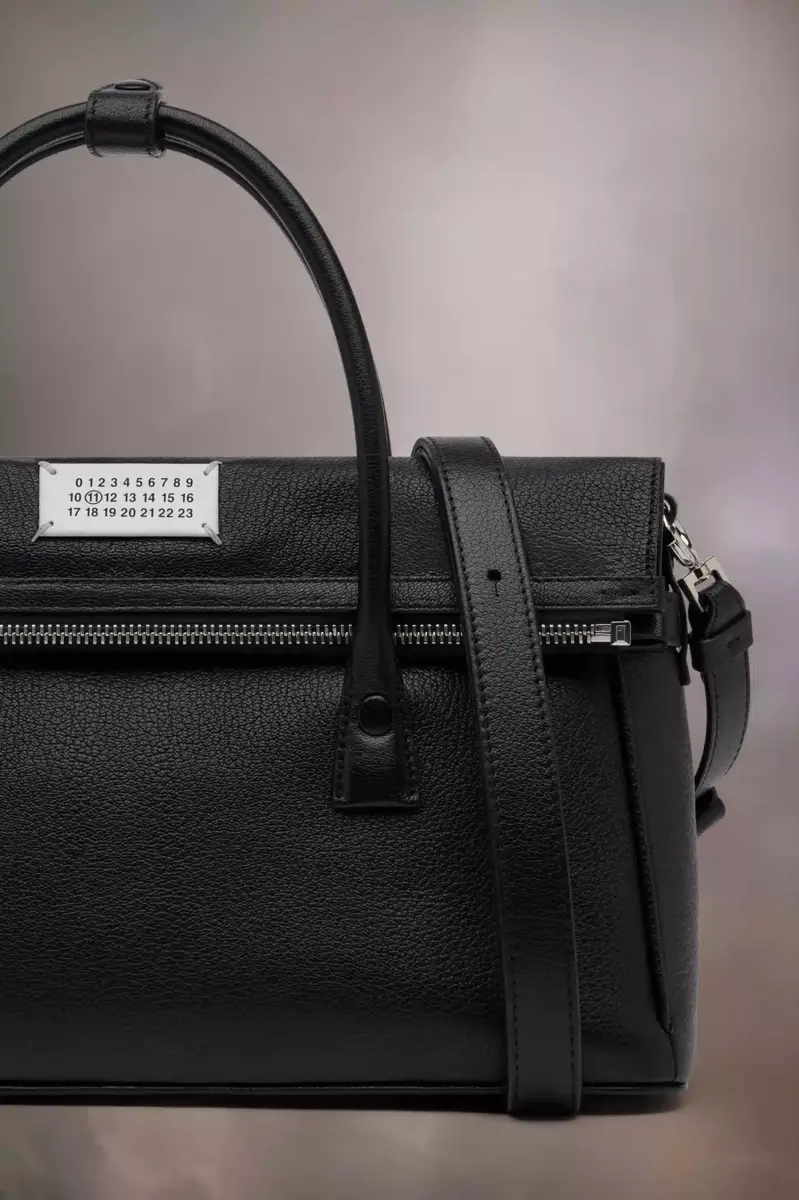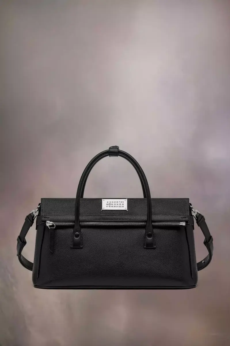 The 5AC East West takes Maison Margiela’s signature 5AC handbag and infuses an Informal Formality mood. Crafted from goat leather, it features top handles and a fold-over design. It is accented with the logo label at the front. The iconic 5AC line takes its name from the French word ‘sac’ (bag). The East West variation is the latest addition to the 5AC family of subverted modern classics, revisited in an elongated size with more volume. Modelled on a men’s briefcase, with a horizontal shape that inspired its name, the bag can be worn by hand, over the shoulder or crossbody. The style continues to explore the Maison’s Anonymity of the lining concept to reveal its internal structure.