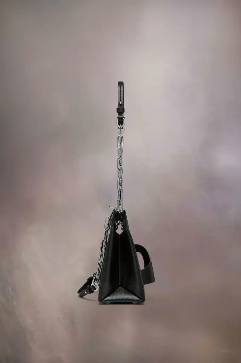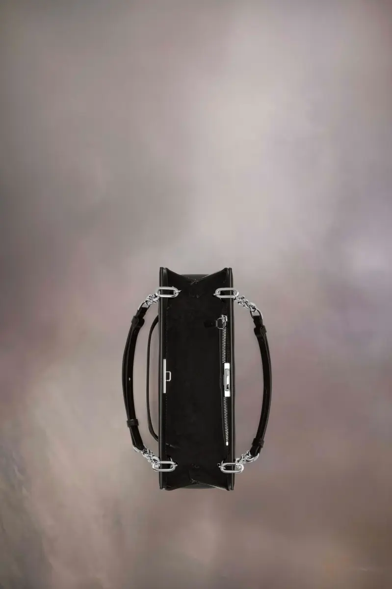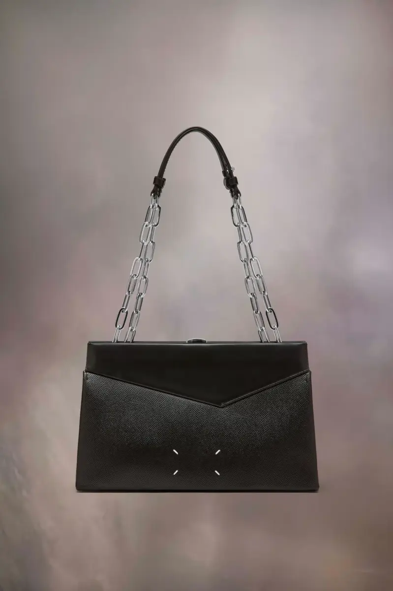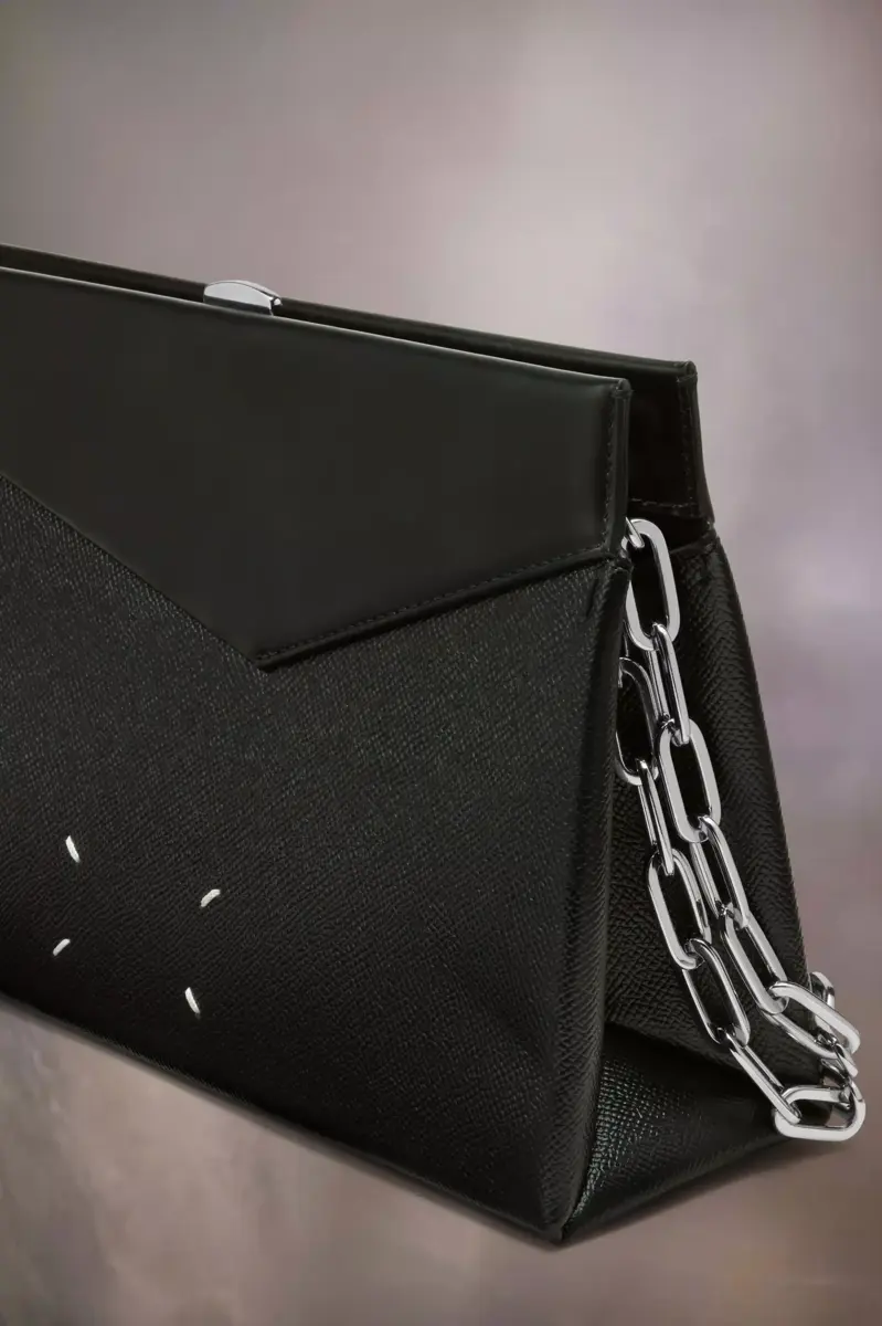 The medium Snatched shoulder bag clutch is crafted from grainy leather. The Snatched debuted in the AW19 Artisanal Collection. It lends its name from the colloquial term for ‘good looks’, and also the way it can be held in a snatching manner. The genderless bag presents an asymmetric shape, inspired by origami. It features a chain strap, and a perforated front handle to be worn as a clutch.