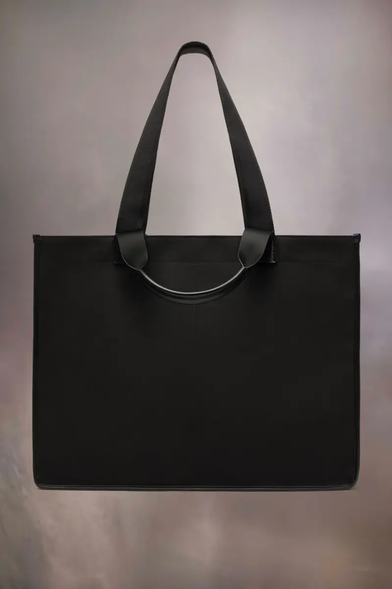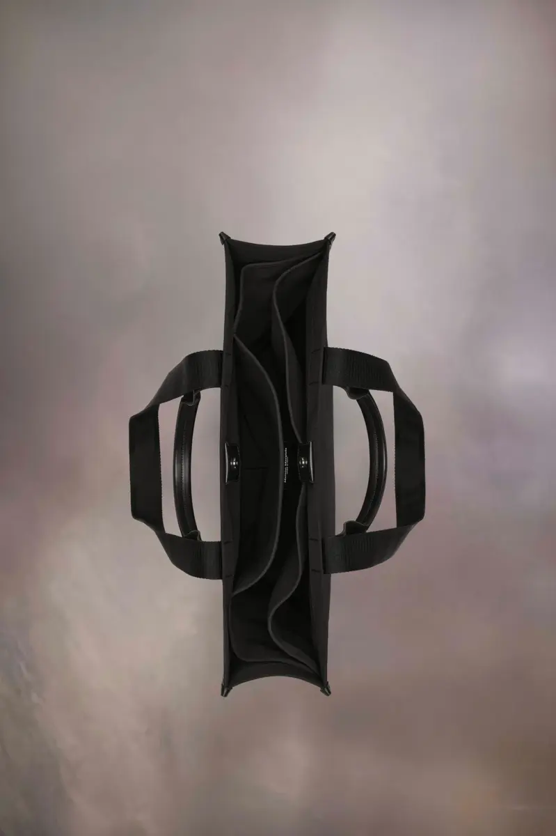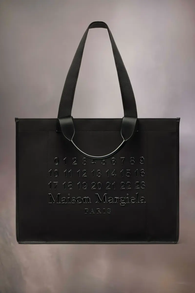 In Mackintosh fabric with patent calf leather contrast, the large Cabas shopping bag is complete with long and short top handles plus inner pockets. It is adorned with the Maison Margiela numeric logo across the front.