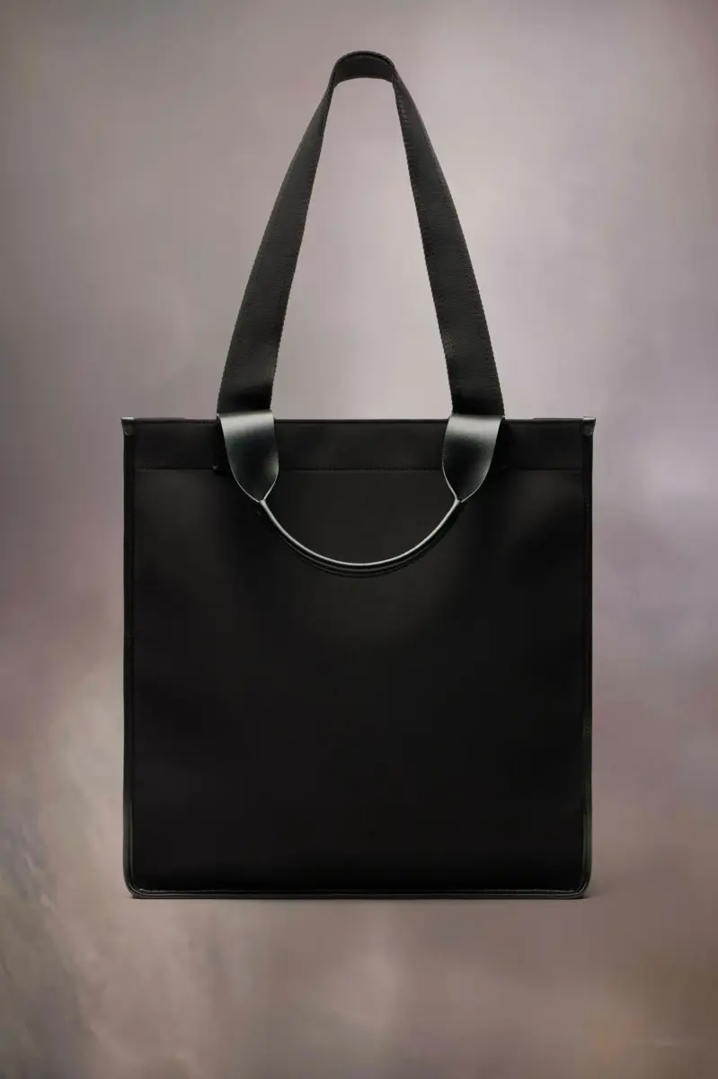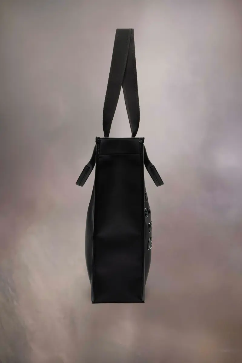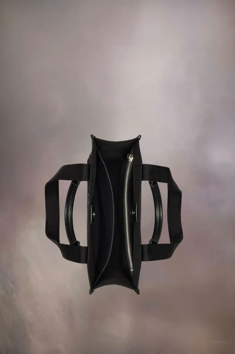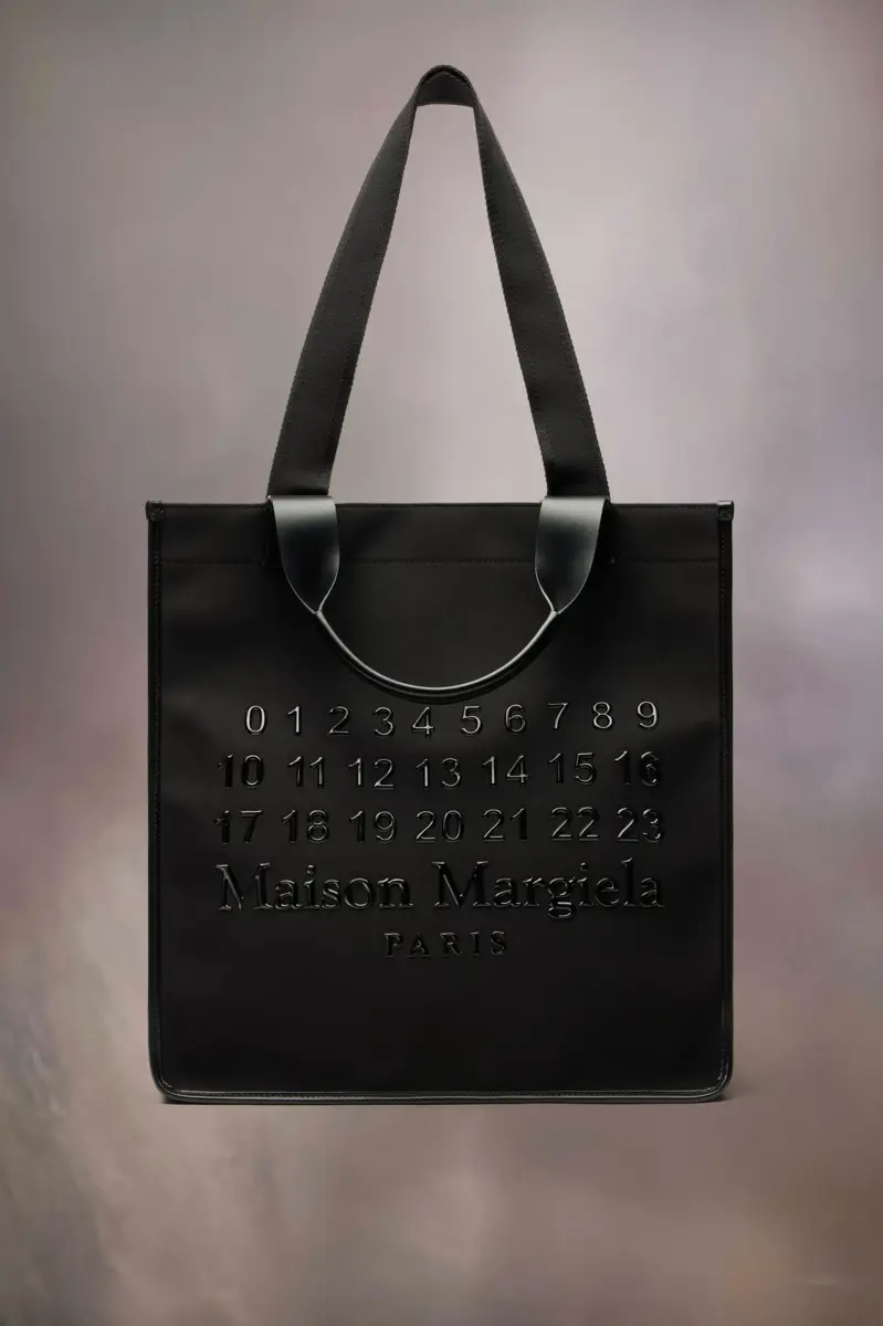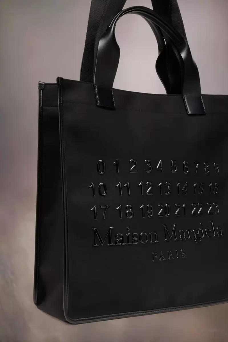 In Mackintosh fabric with patent calf leather contrast, the vertical Cabas shopping bag is complete with long and short top handles plus inner pockets. It is adorned with the Maison Margiela numeric logo across the front.