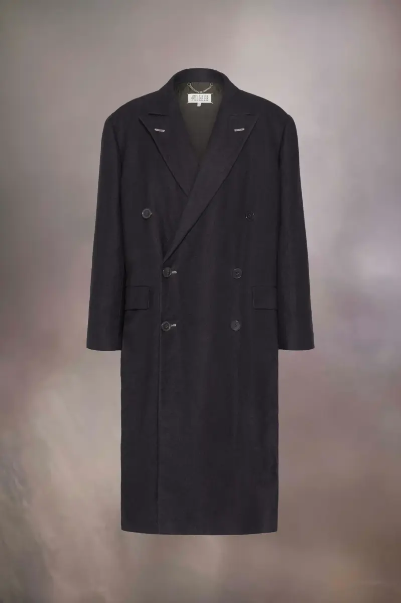 Inspired by classic gentleman’s outerwear, the woven long coat in a linen and wool blend has an oversized silhouette lending a gesture of louche style. Contrast Work-in-progress stitches can be seen throughout, with a back belt and inverted box pleat, double-breasted front and flap pockets. Maison Margiela’s signature, the four stitches, appear at the back; the opposite of a label.