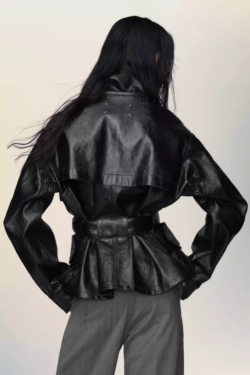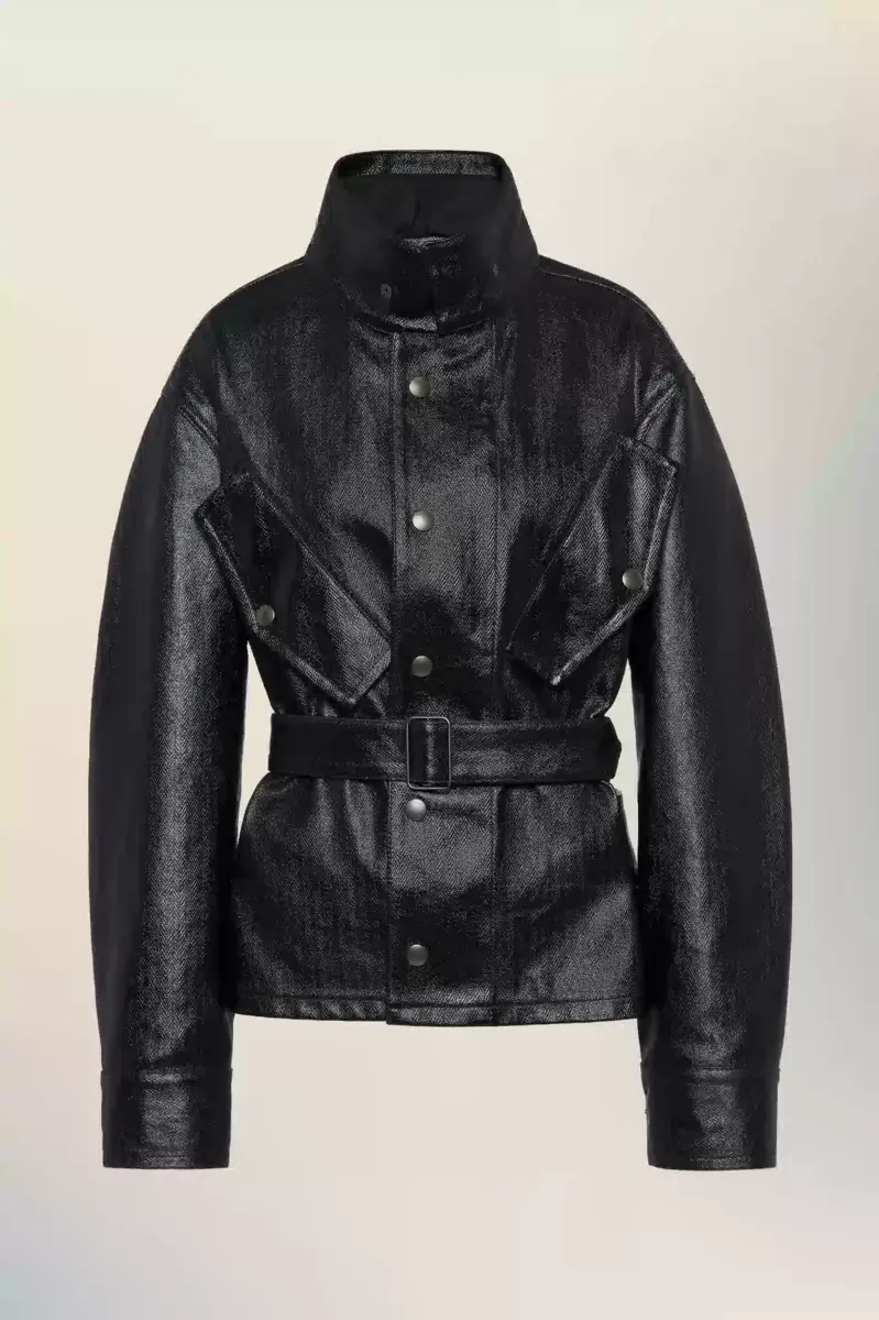 Structured in laminated cotton, this jacket plays with light and form. The coated surface enhances its utilitarian cut – complete with flap pockets, snap fastenings, and a cinched waist – while movement reveals a tactile herringbone texture beneath the sheen. Maison Margiela’s signature, the four stitches, appear at the back; the opposite of a label.