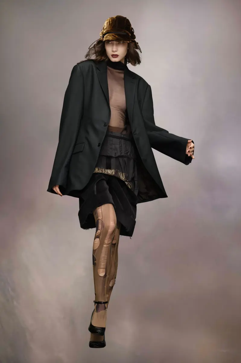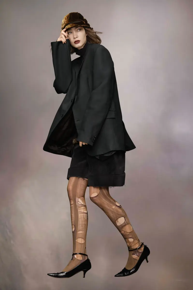 Crafted from mohair wool, the suit jacket has a long-line silhouette with slightly oversized proportions. It features single-breasted buttons, a notched collar, pockets and buttons at the cuffs. Two work-in-progress cross-stitches adorn the back hem to allude to a garment never being finished. Maison Margiela’s signature, the four stitches, appear at the back; the opposite of a label.