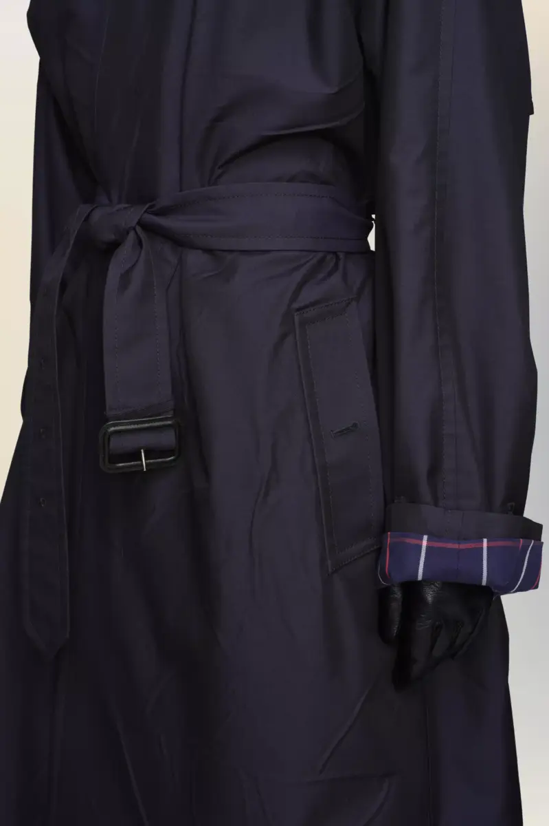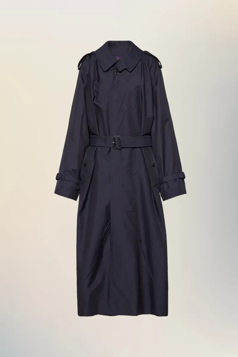 This long trench coat reflects Maison Margiela’s reworking of heritage archetypes. Traditional details – such as the waist belt and epaulettes – are retained but softened through a relaxed structure and minimal finish. The Memory of the Creases technique leaves behind subtle impressions of where folds once were, capturing the idea of a garment shaped by time. Maison Margiela’s signature, the four stitches, appear at the back; the opposite of a label.