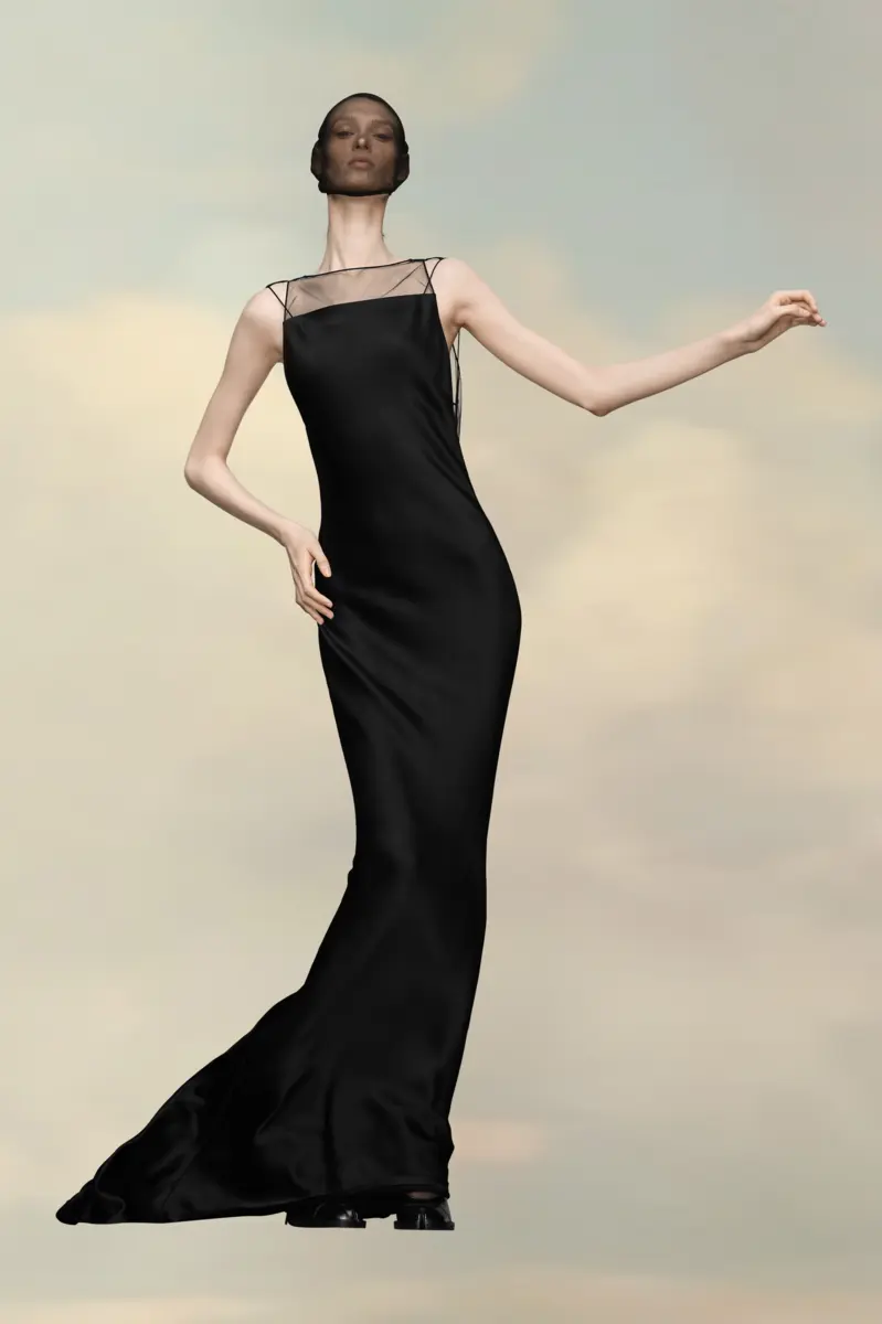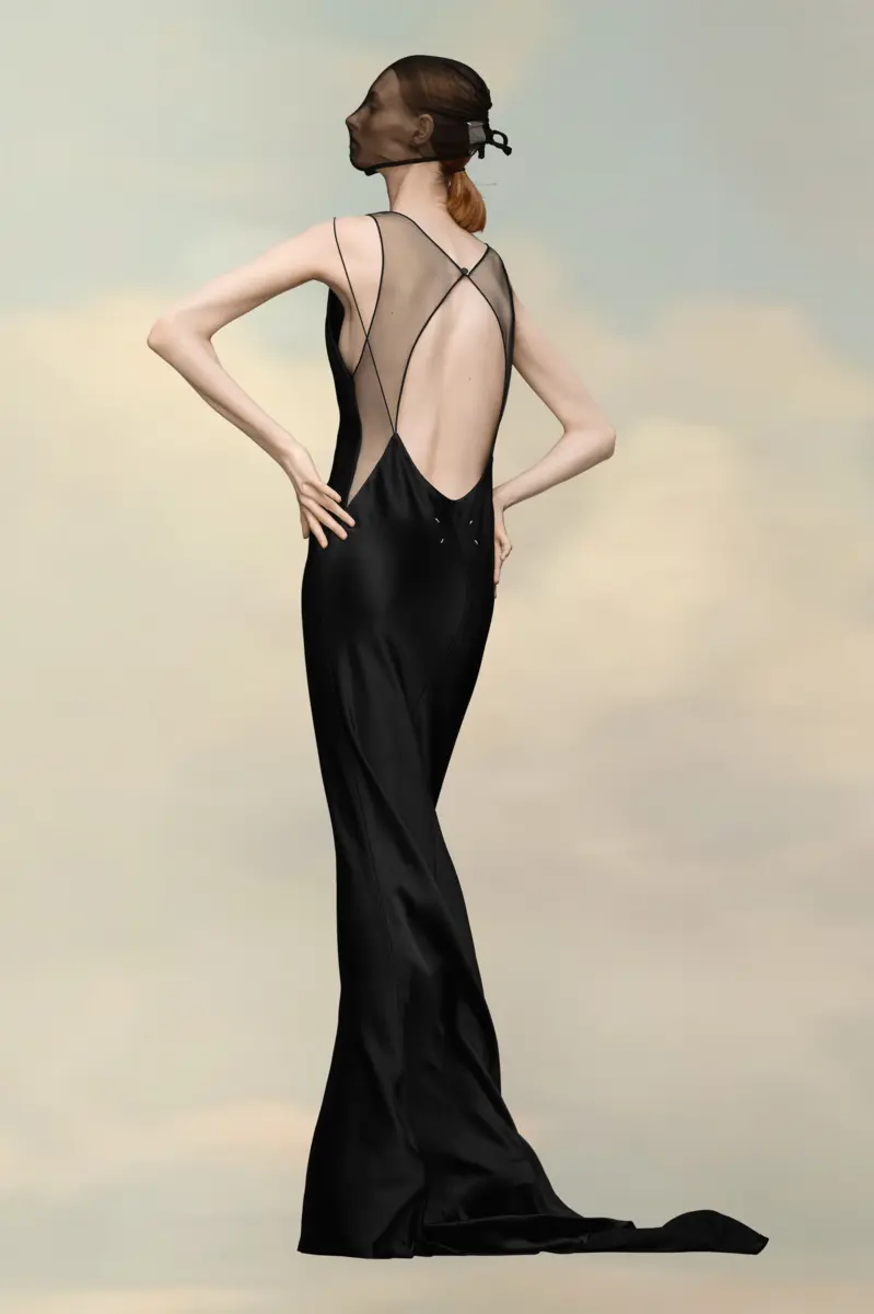In hammered satin, this maxi dress which pools on the floor, follows a sleeveless design with a boat neck. Sheer panelling features at the chest and around the back, with a large cut-out. It’s finished with four white stitches showing the hand of the Maison: the opposite of a label.