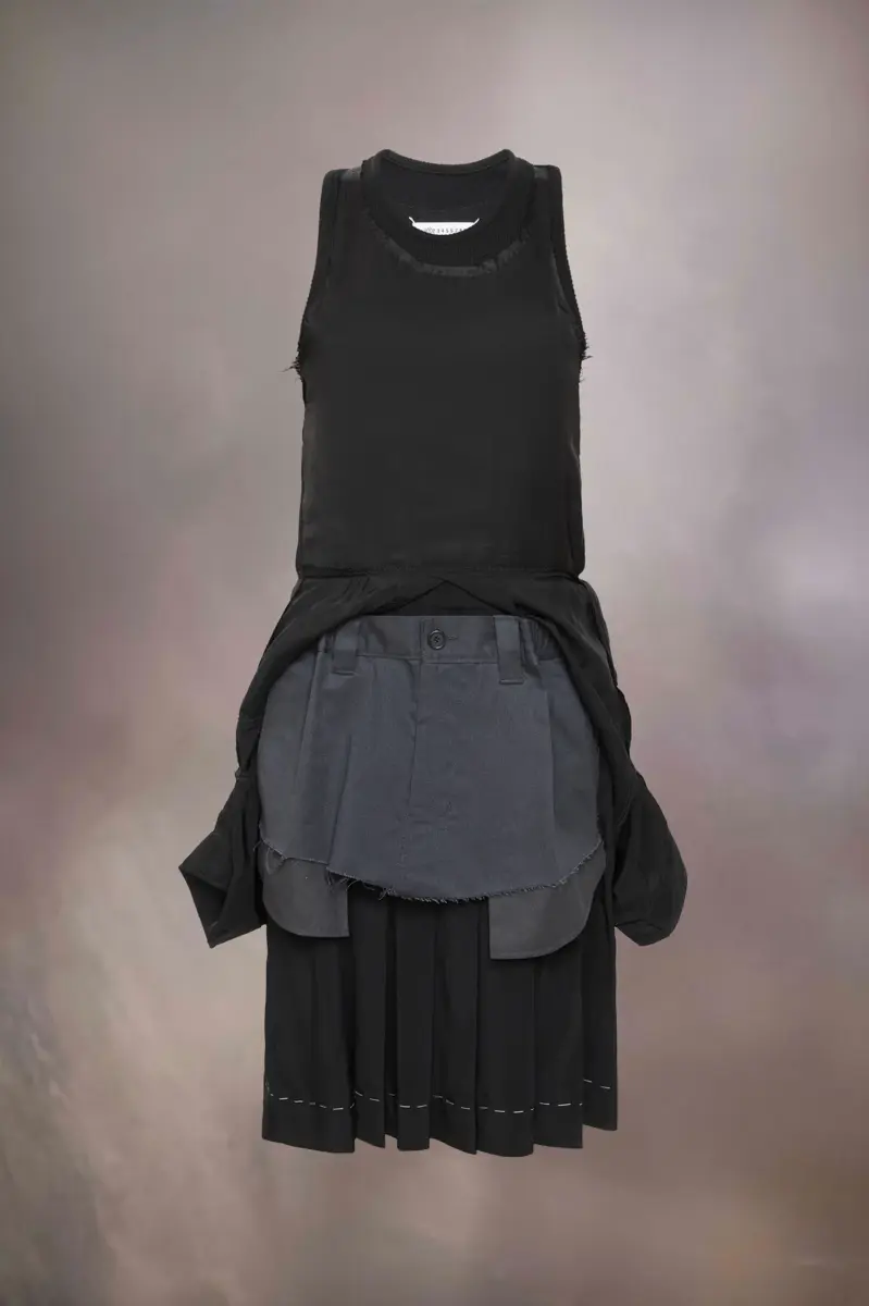 A true experimentation of the Maison’s Anonymity of the lining technique, the viscose-cotton dress showcases revealed layers. The first skirt is cut at the knee with work-in-progress stitches around the hem, with a second layer slashed to reveal the pockets. The third layer, a reworked shirt, creates an exaggerated silhouette, while the top of the dress features a double layer scoop neckline. Maison Margiela’s signature, the four stitches, appear at the back; the opposite of a label.