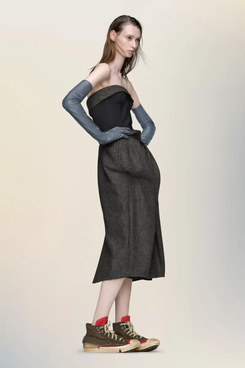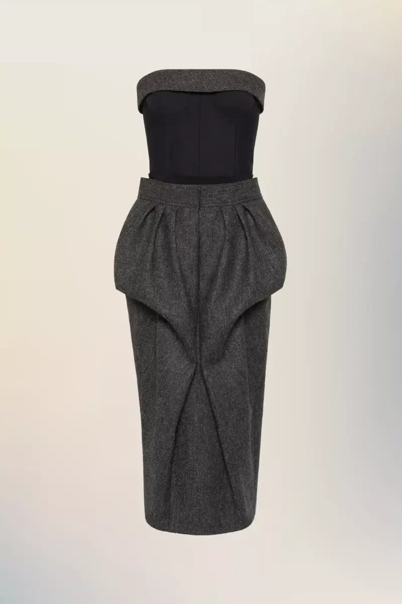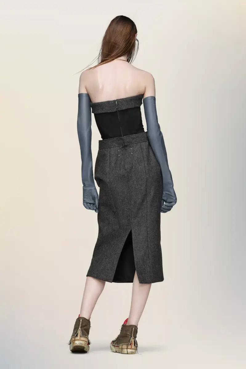 A strapless wool dress that balances architectural volume with a sense of ease. The upper body is held in place by a structured bustier, while the skirt exaggerates the natural silhouette through pleats that recall the Maison’s Gestural Cutting technique. At the back, the Maison’s signature four stitches appear; the opposite of a label.