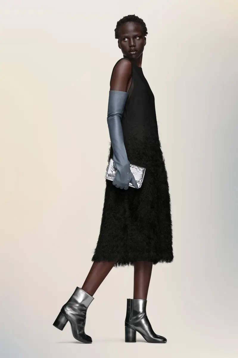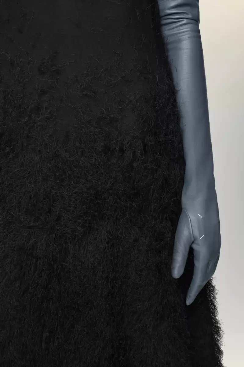 Crafted in silk knit, this sleeveless dress deconstructs surface texture through the Maison’s Retrograding technique – where density and detail degrade from hem to neckline. The fabric shifts from a plush, voluminous base into a light gauze at the top, evoking the fading of an unfinished sketch. Sheer throughout, the piece is underpinned by a tonal detachable slip dress lining. At the back, the four stitches appear; the opposite of a label.