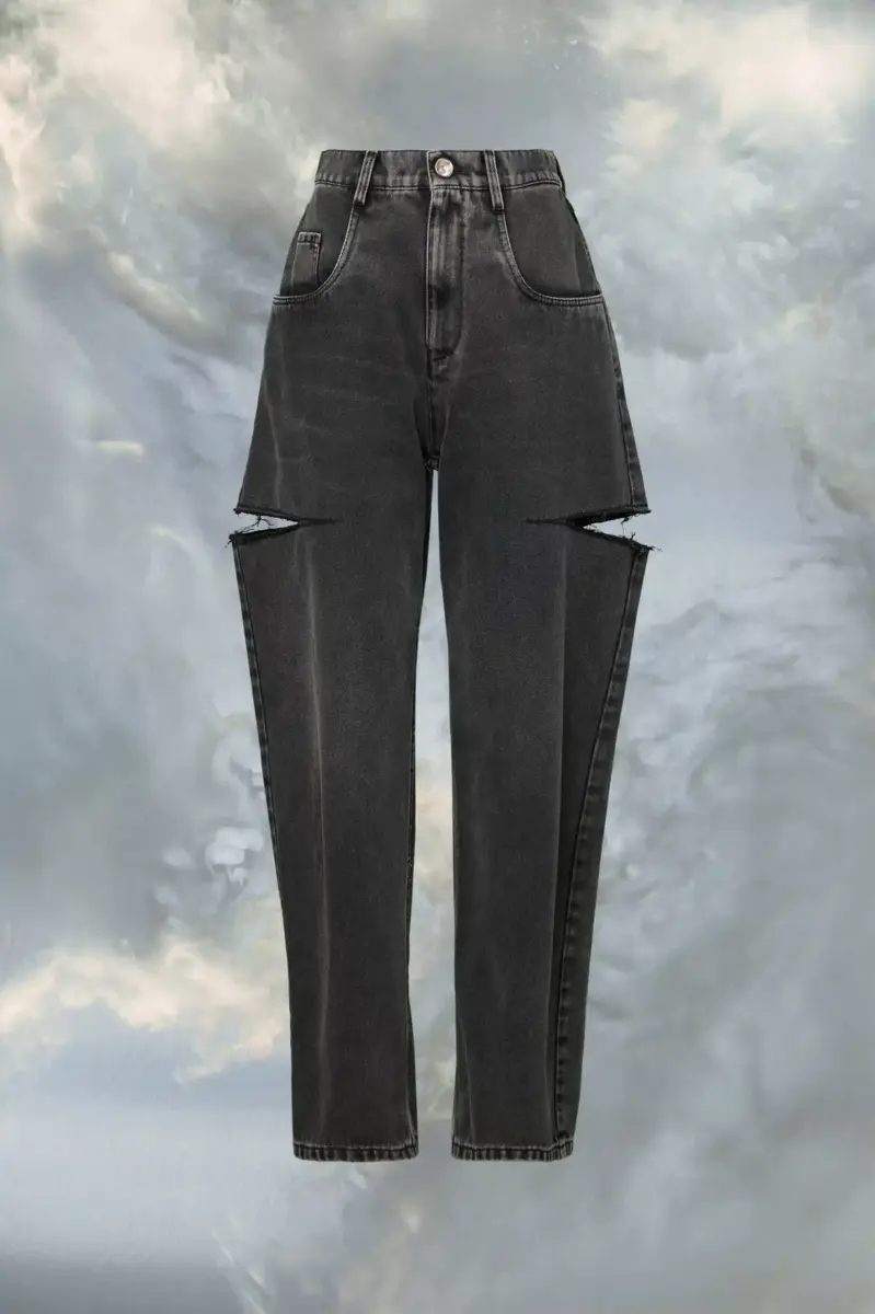 The jeans with a distressed wash feature cut-out slits at the thighs with raw edges. They come with five-pocket styling and belt loops. Maison Margiela’s signature Four stitches appear at the back; the opposite of a label.