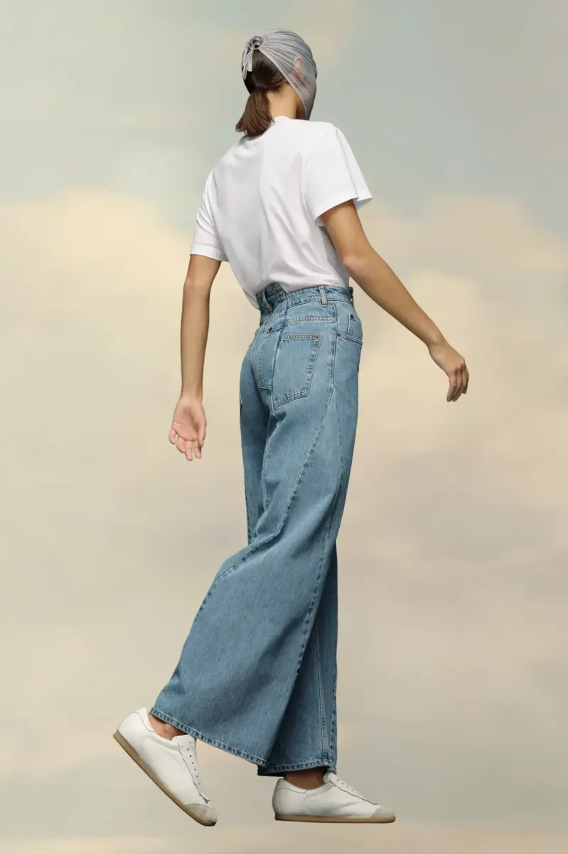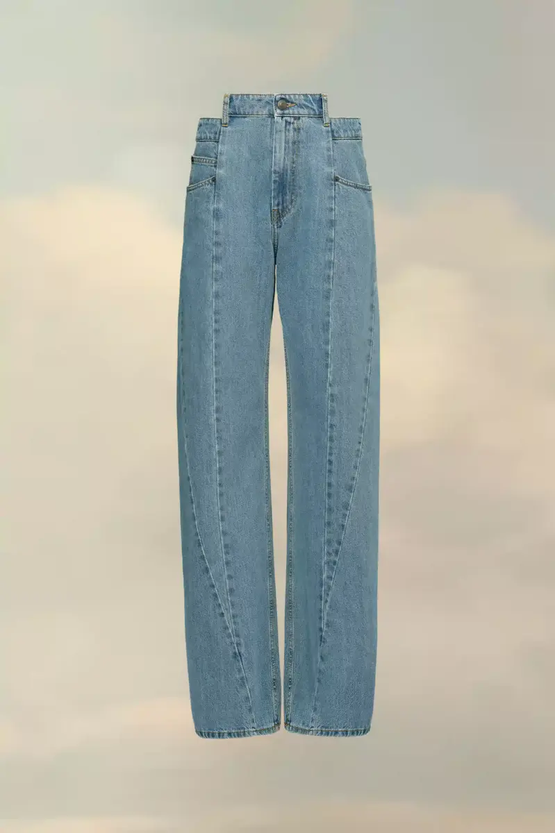 The classic denim jean has been reworked with a cut-out waistband and panel detailing for an elongated effect. This stonewashed, cotton pair offers a relaxed fit with full-length straight legs. Five pockets and belt loops are met with a contrasting topstitch.
