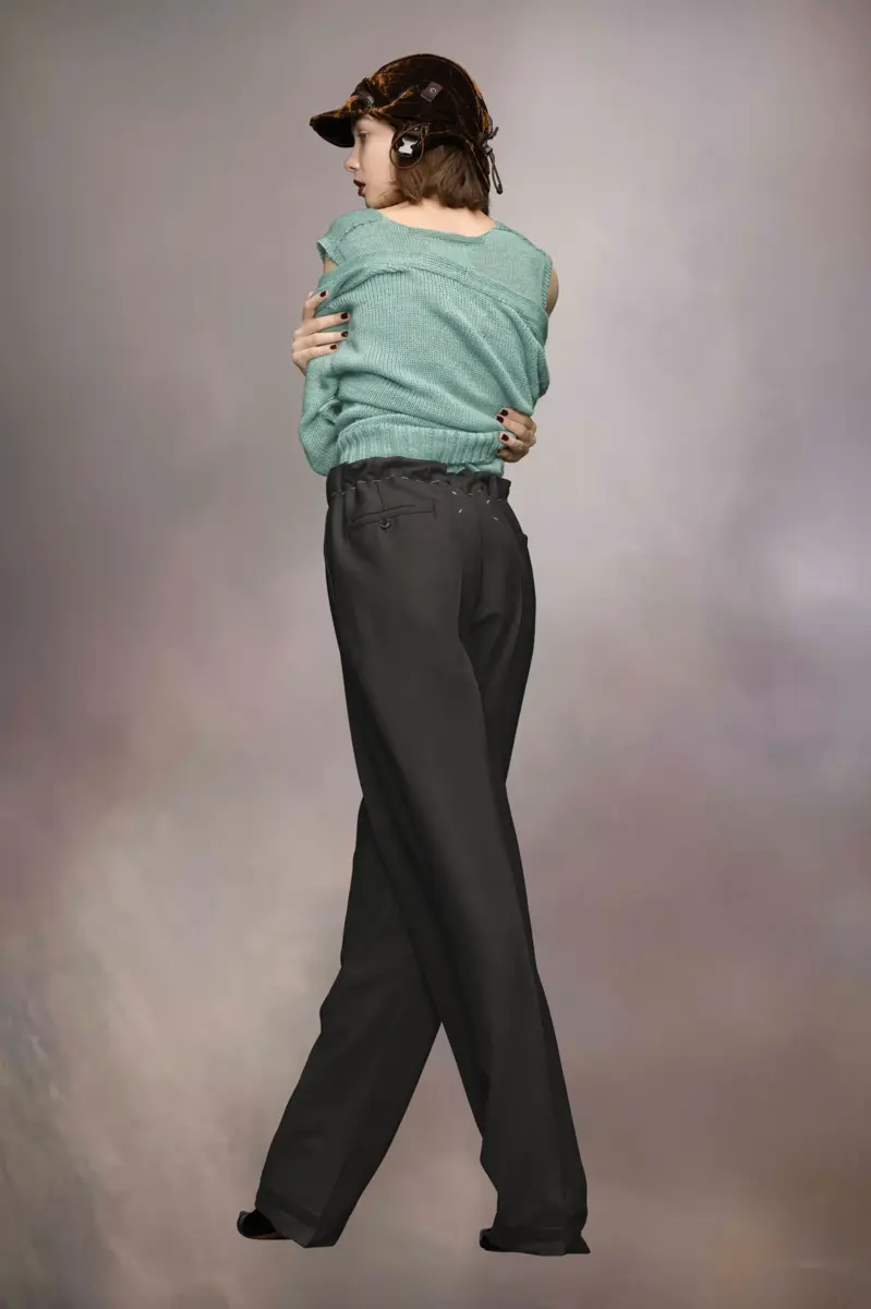 The trousers are crafted from mohair wool. They feature pleats down the front and back – a smart contrast to the tied drawstring waist. Contrast work-in-progress stitches circle the waistband for a style disruption indicating the garment is never finished. Maison Margiela’s signature, the four stitches, appear at the back; the opposite of a label.