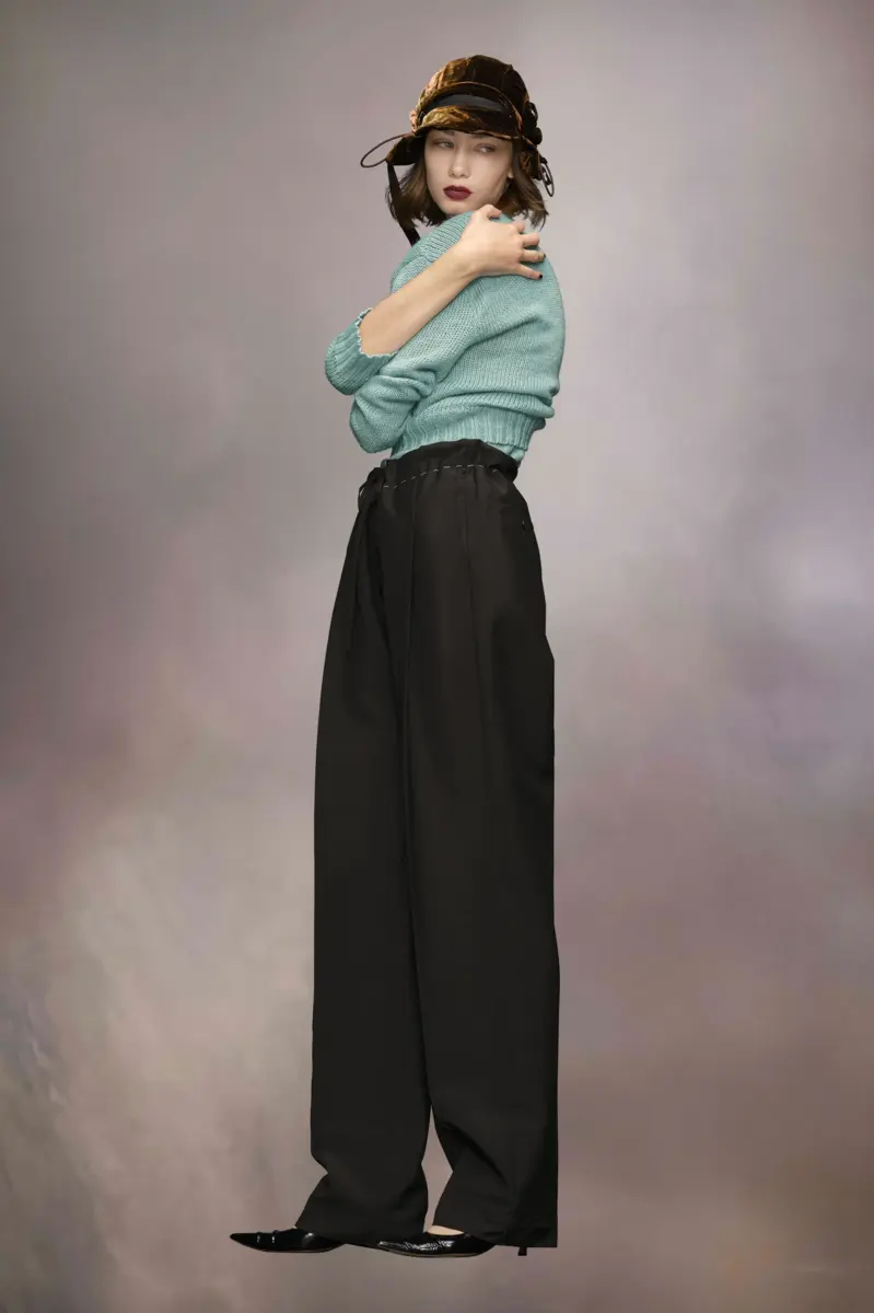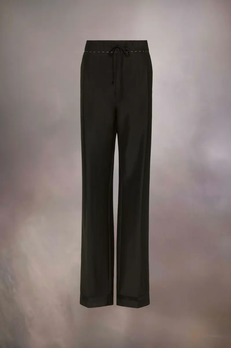 The trousers are crafted from mohair wool. They feature an extra-long length with pleats down the front and back – a smart contrast to the tied drawstring waist. A tonal band appears around the bottom of each leg as well as contrast work-in-progress stitches which circle the waistband for a style disruption. Maison Margiela’s signature, the four stitches, appear at the back; the opposite of a label.