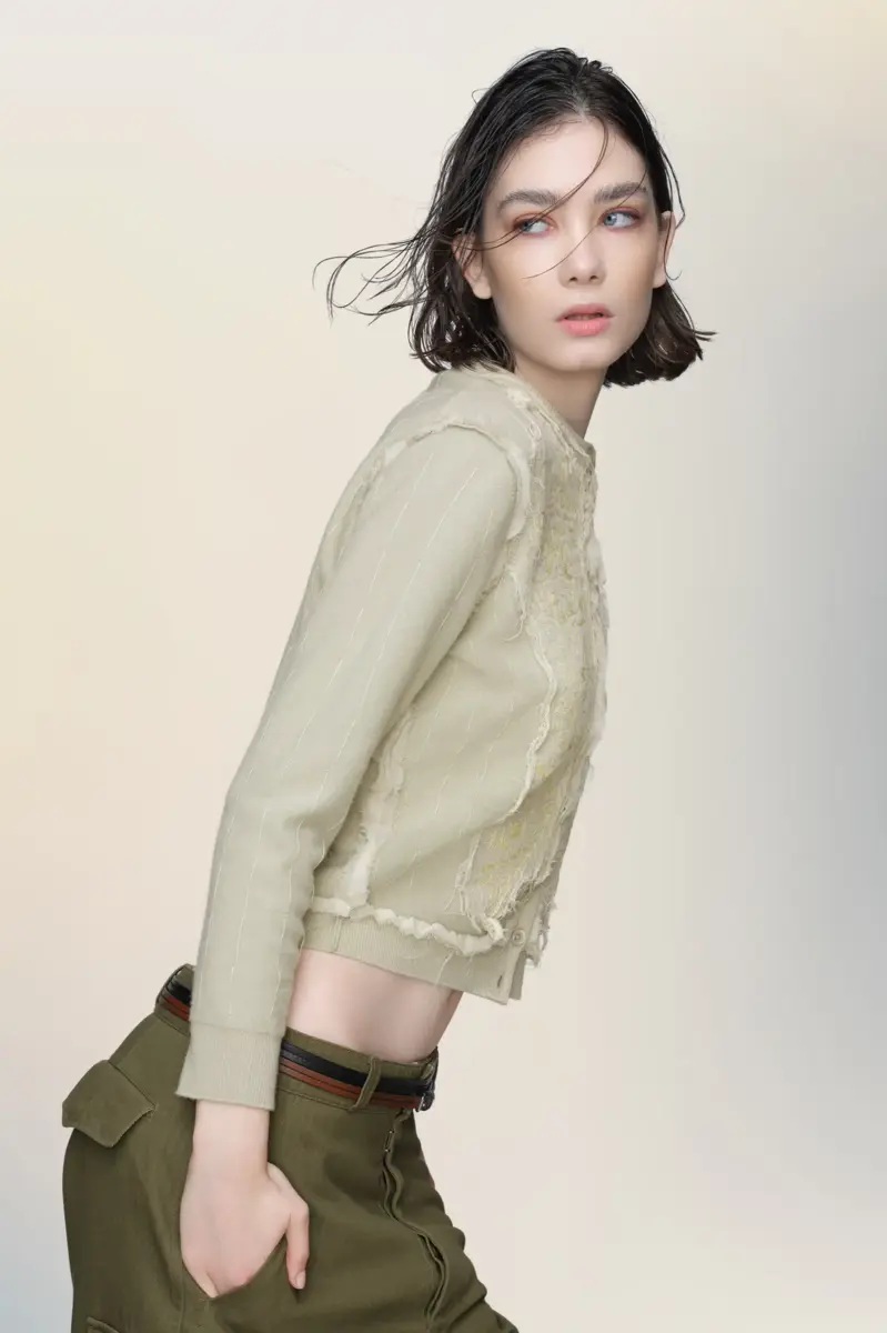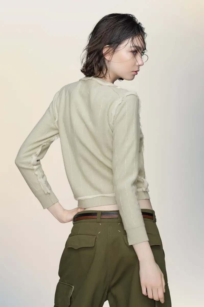 This cardigan is framed by contrast, with appliqué patches that resemble the reverse side of delicately embroidered fabric. Vertical stitch lines mirror the inside of a garment, aligning with the Maison’s décortiqué approach. Maison Margiela’s signature, the four stitches, appear at the back; the opposite of a label.
