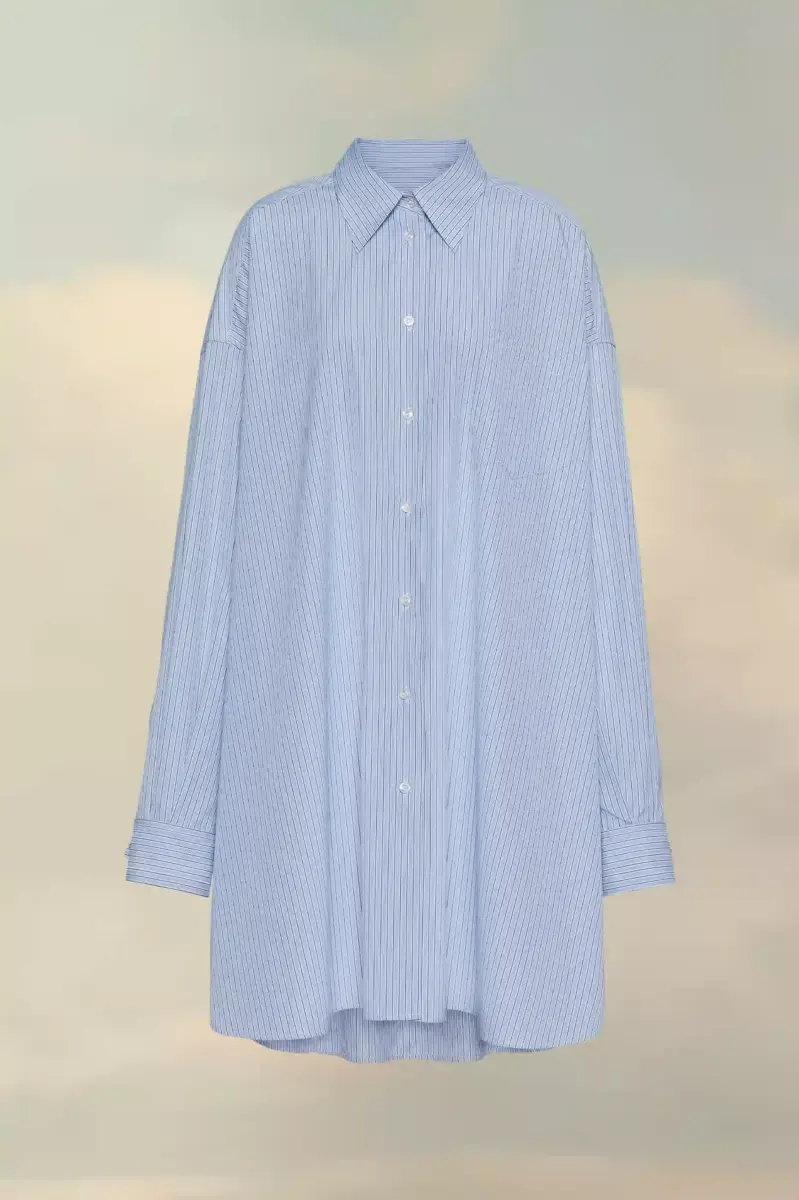 A classic shirt in pinstriped cotton poplin, with a collar, buttoned placket and chest pocket. At the back, four white stitches show the hand of the Maison: the opposite of a label.