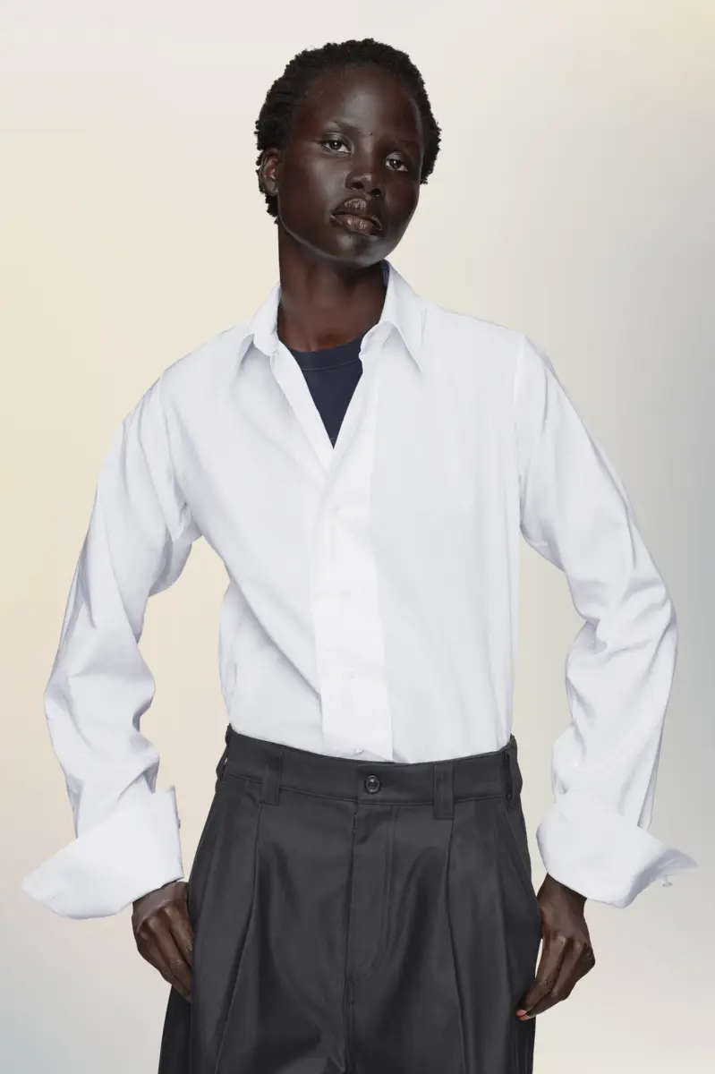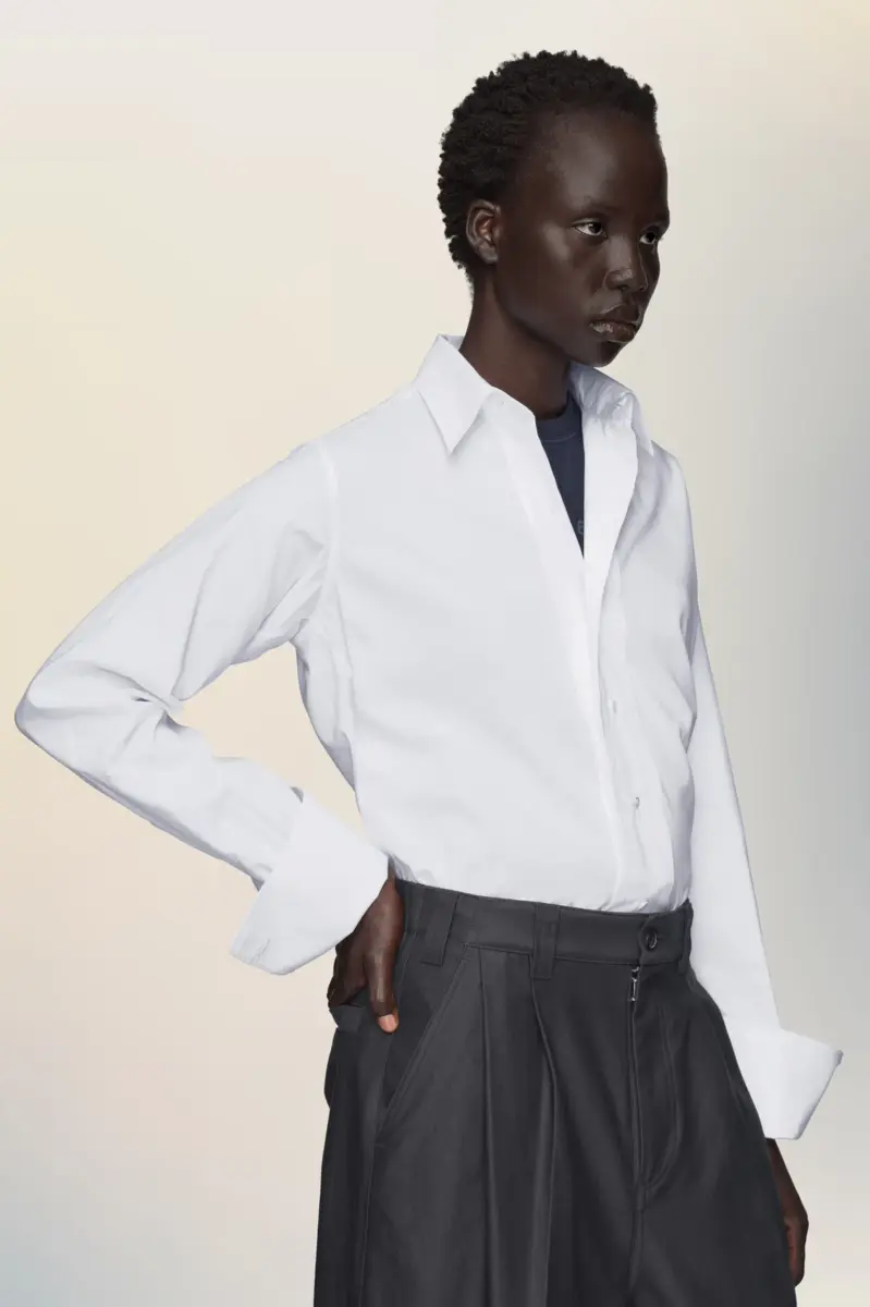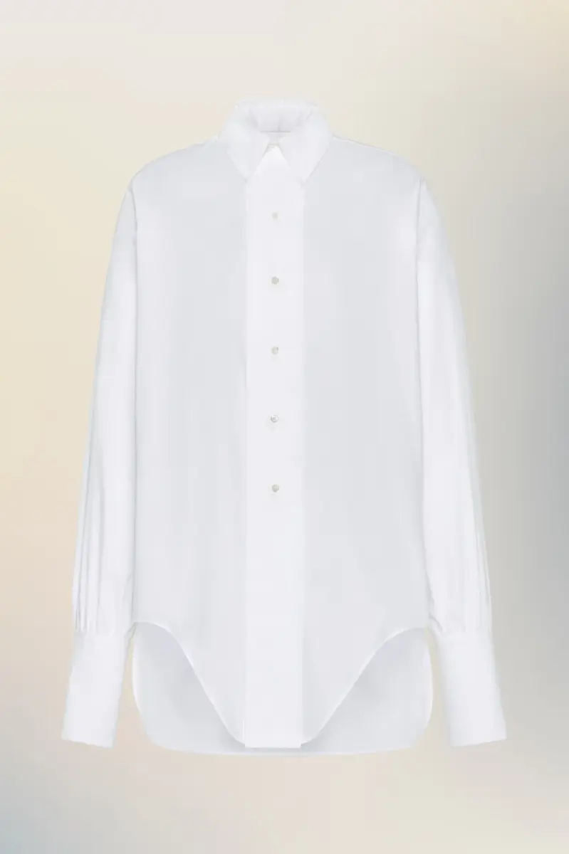 This cotton shirt plays with proportion, cutting a clean silhouette from classic elements: sharp collar, oversized cuffs, and a curved hem. Familiar components, restructured. At the back, the Maison’s signature four stitches appear; the opposite of a label.