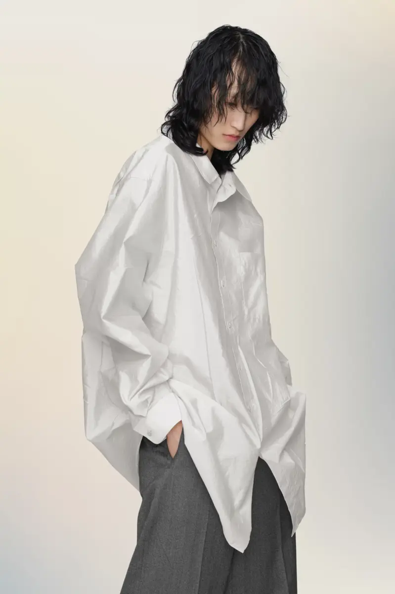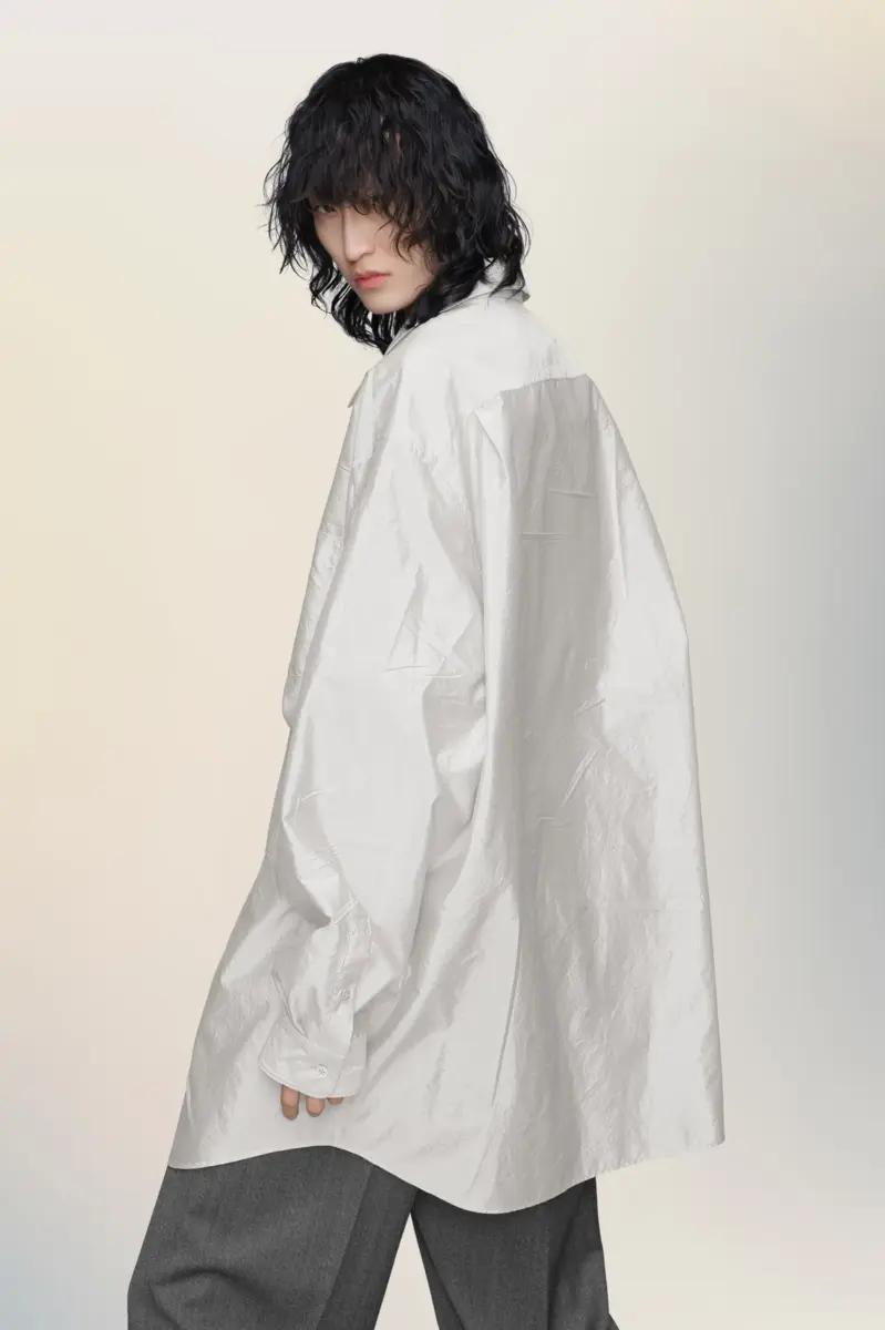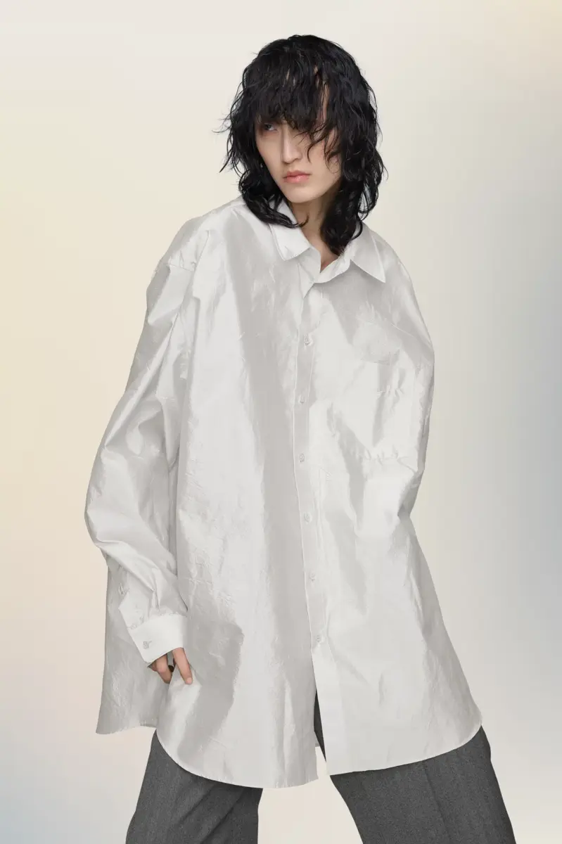 Softly structured, this oversized shirt is cut from lustrous fabric that captures the light and movement of the body. Subtle surface irregularities reflect the Maison’s technique of Memory of the Creases, preserving traces of wear and motion to evoke a lived-in elegance. Maison Margiela’s signature, the four stitches, appear at the back; the opposite of a label.