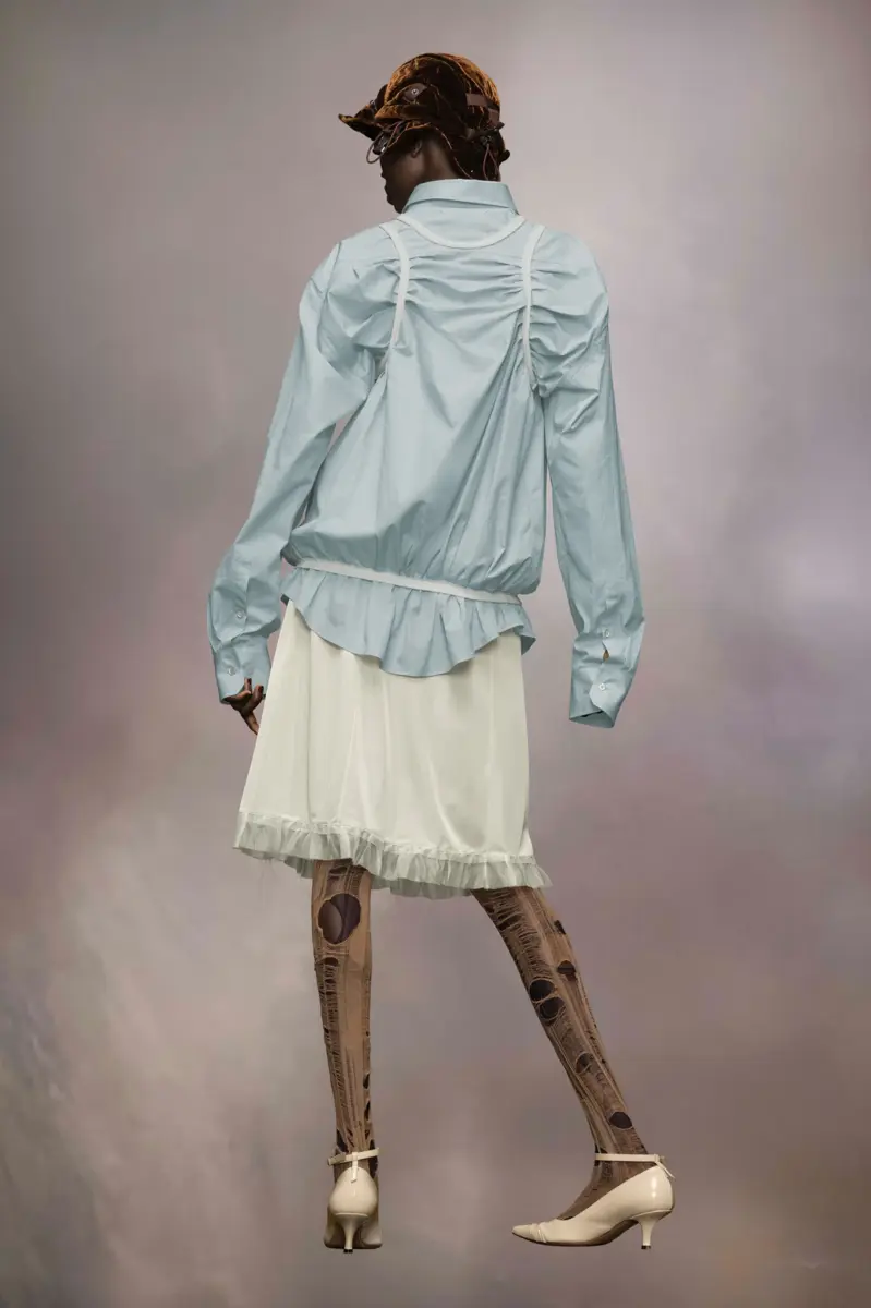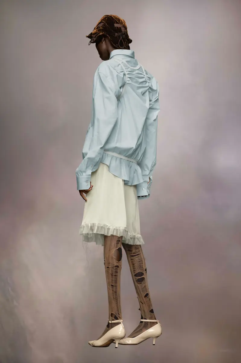 The shirt is crafted from cotton, featuring a classic smart collar, central buttons and a single chest pocket. The cuffs are buttoned and it is designed with a curved hem. To update the silhouette, piping appears in a Décortiqué tank top shape around the shoulders and by the hem, creating a ruching effect. Maison Margiela’s signature, the four stitches, appear at the back; the opposite of a label.