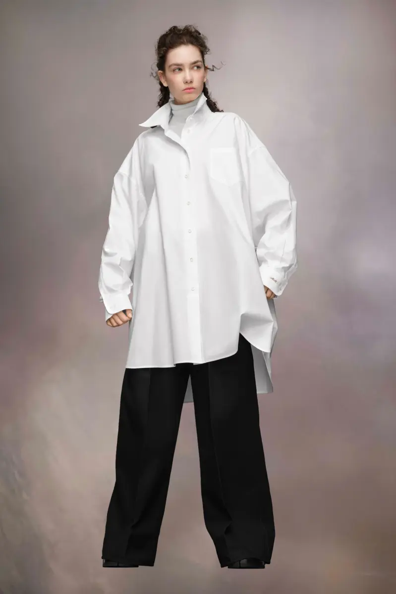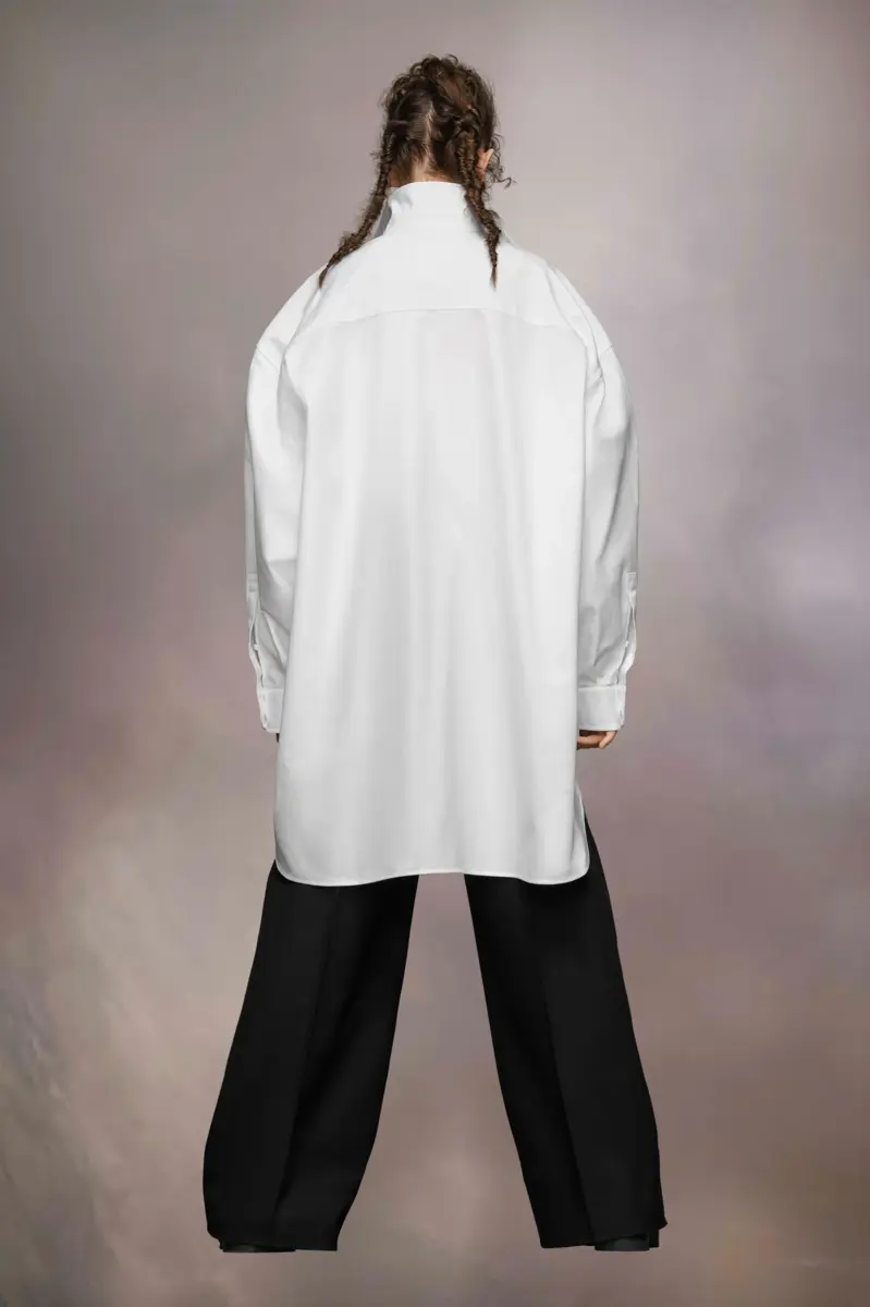 The long shirt is crafted from cotton poplin with a classic collar, patch pocket and curved hem. Maison Margiela’s signature, the Four stitches, appear at the back; the opposite of a label.