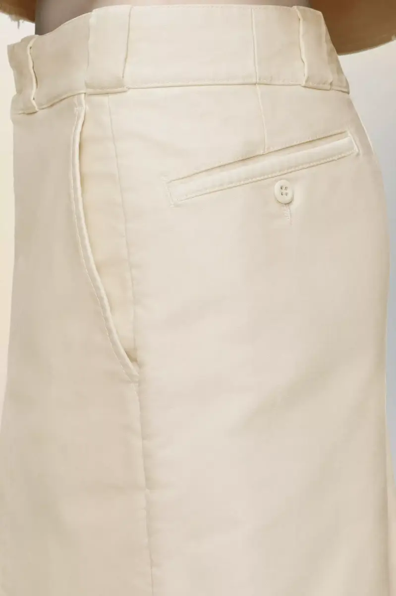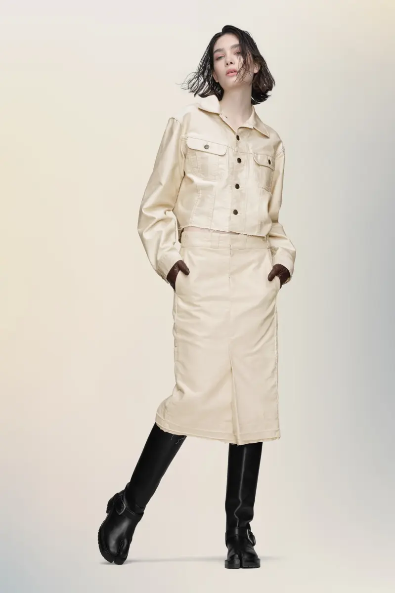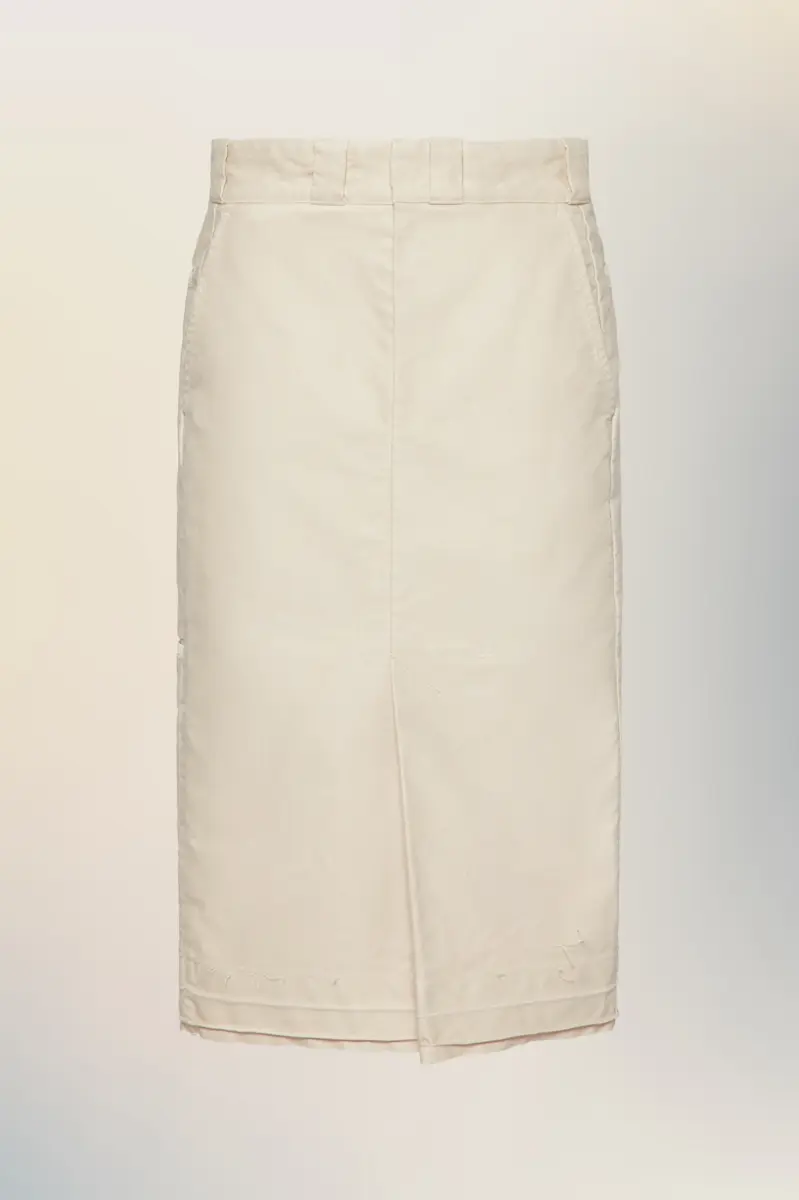 A straight-cut chino skirt, finished with a raw hem and softened fold that hint at previous construction. The stitch markings and subtle irregularities evoke the Maison’s Memory of the Hem, where absence becomes part of the design. Maison Margiela’s signature, the four stitches, appear at the back; the opposite of a label.