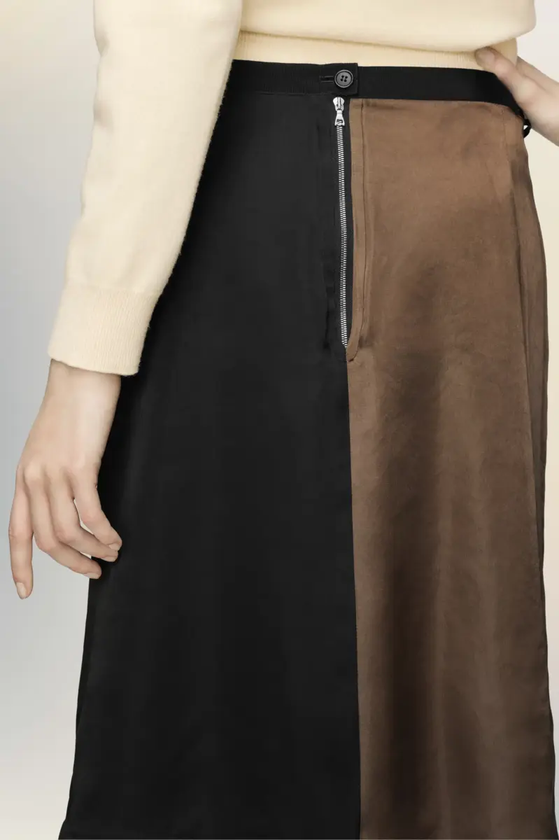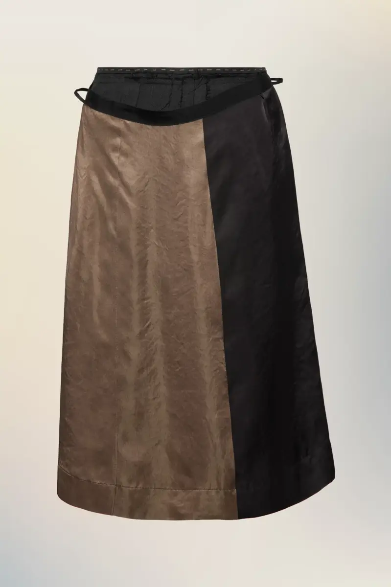 Constructed with contrast panels and an exposed inner waistband, this midi skirt plays with the idea of function and reversal. Designed to be worn multiple ways, it invites experimentation with styling and silhouette. Maison Margiela’s Anonymity of the Lining reveals the inner workings.