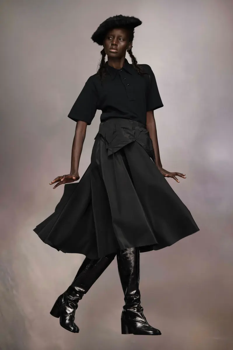 Created in poly taffeta, the voluminous midi skirt features a folded down front, reworking the silhouette; complete with the Maison’s Work-in-progress stitches. The back sports a bow and open zip to further the unfinished aesthetic. Maison Margiela’s signature, the Four stitches, appear at the back; the opposite of a label.