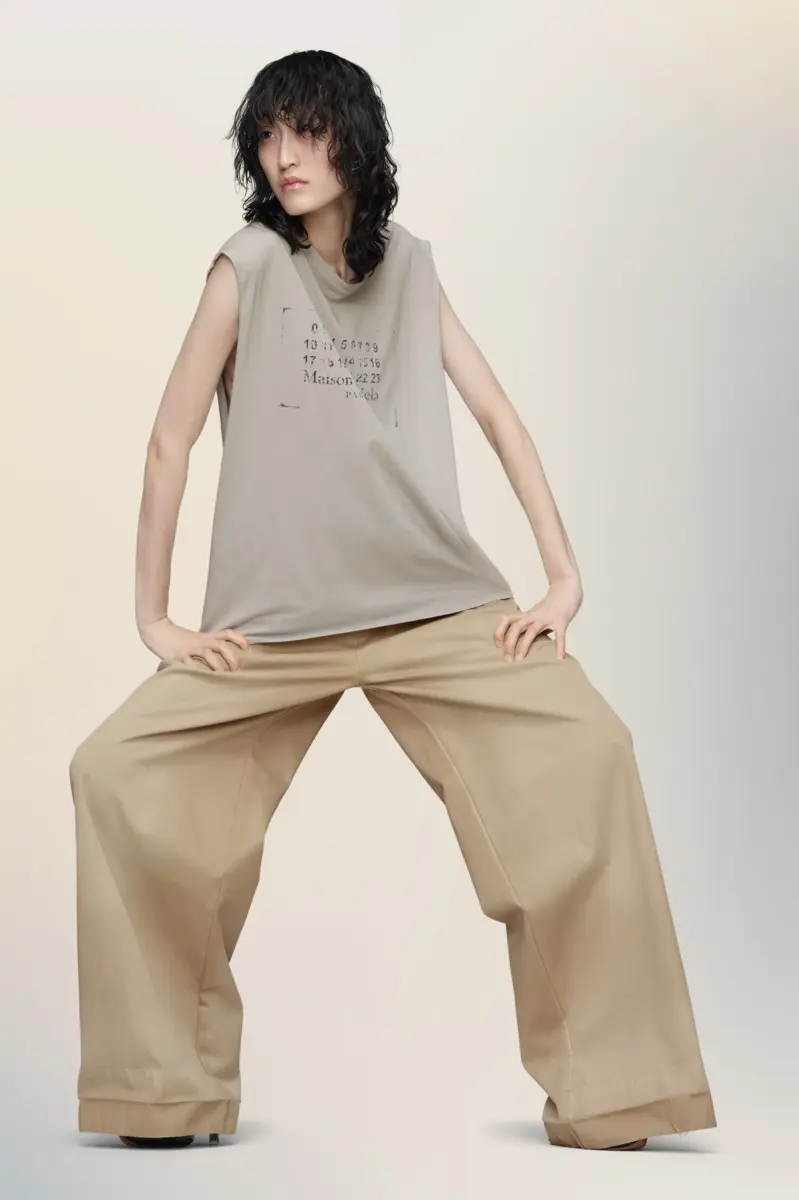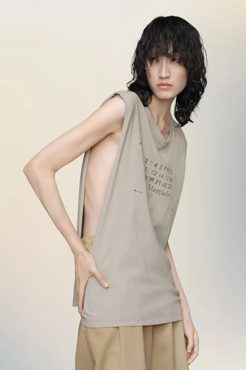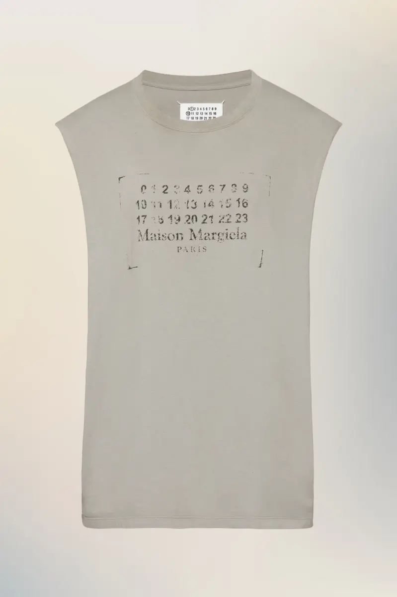 Minimalist in construction and cut for easy layering, this sleeveless top is finished with raw edges and a faded take on the Maison’s numeric logo. Maison Margiela’s signature, the four stitches, appear at the back; the opposite of a label.