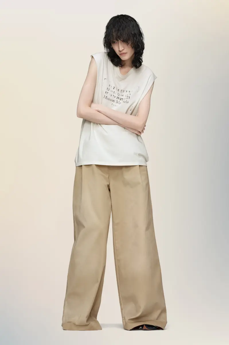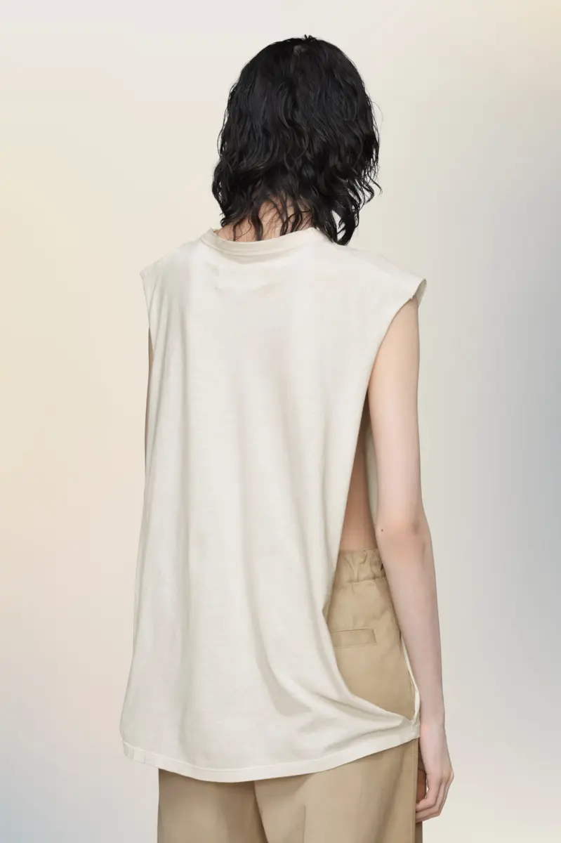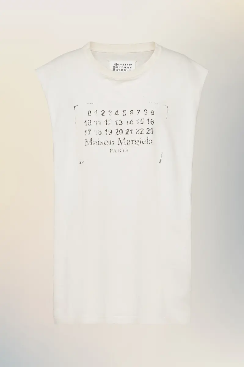 Minimalist in construction and cut for easy layering, this sleeveless top is finished with raw edges and a faded take on the Maison’s numeric logo. Maison Margiela’s signature, the four stitches, appear at the back; the opposite of a label.