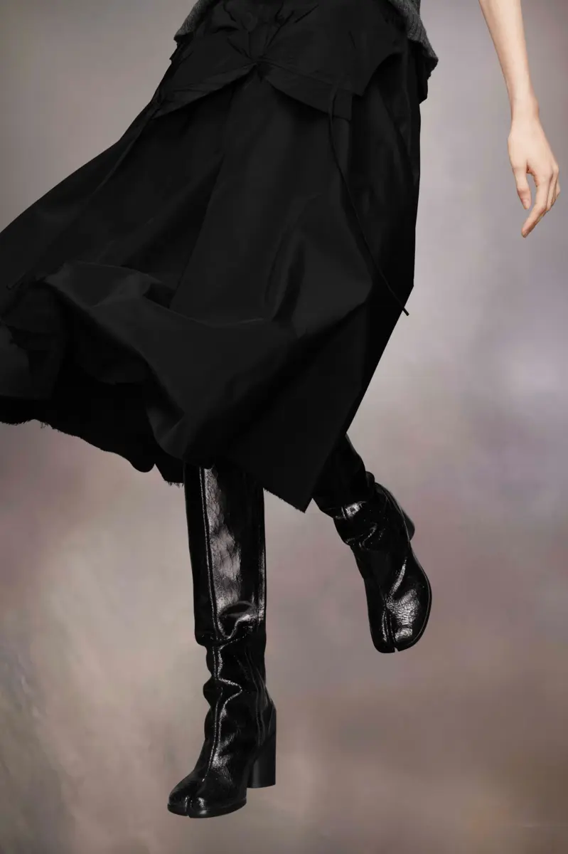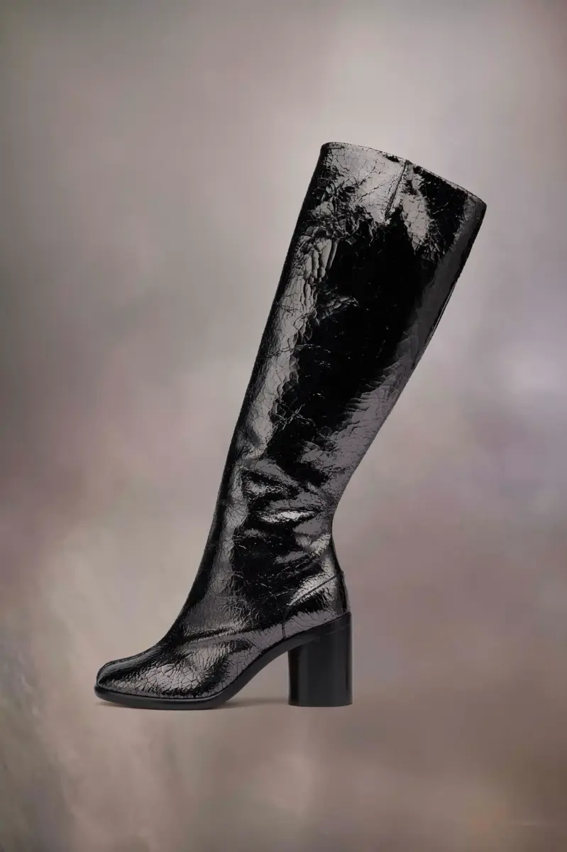 With a broken mirror finish, these heeled knee-high boots feature the Tabi split-toe, inspired by the traditional 15th century Japanese sock bearing the same name – launched for the Maison’s debut collection in 1989. It captures the avant-garde and insubordinate spirit of the Maison and exists as a heritage classic, continually explored through each collection.