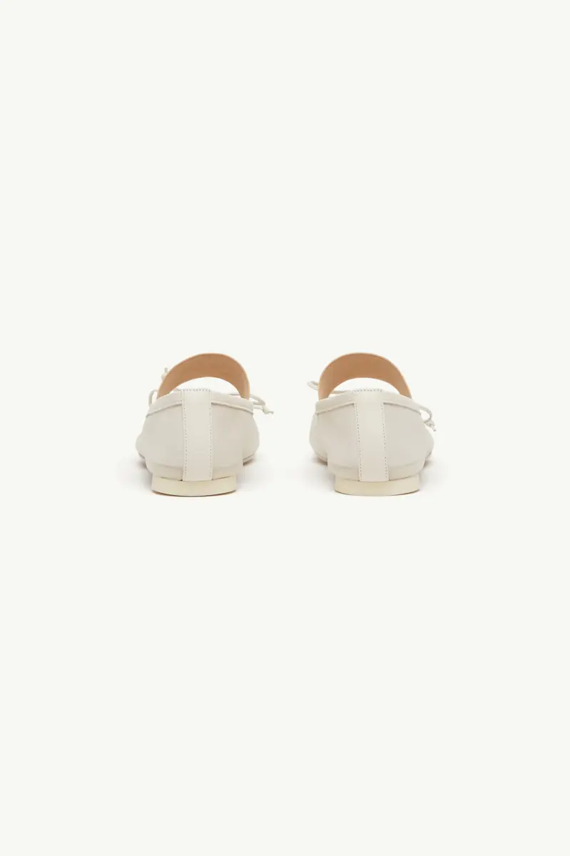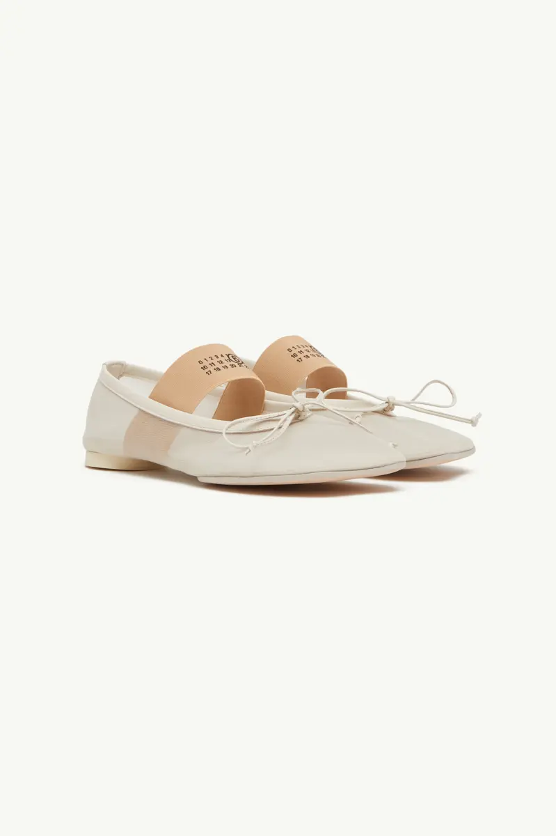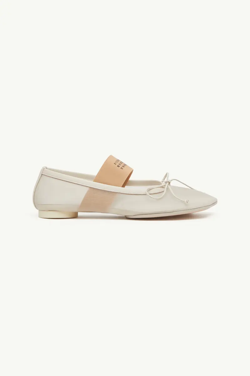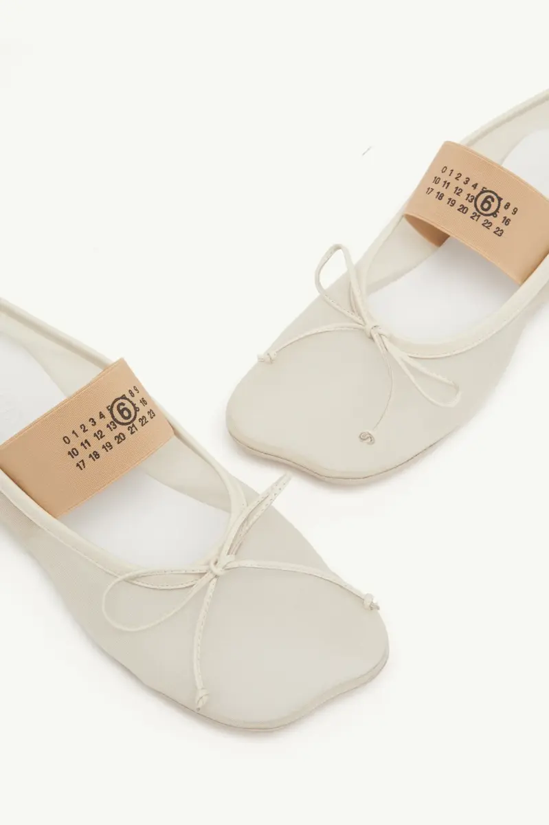 MM6 reinterprets ballerinas in a transparent finish with its signature anatomic toe, subtly distorting a familiar silhouette. A delicate bow adds a touch of elegance, while the numeric logo elastic across the front grounds the design in the Maison’s codes.