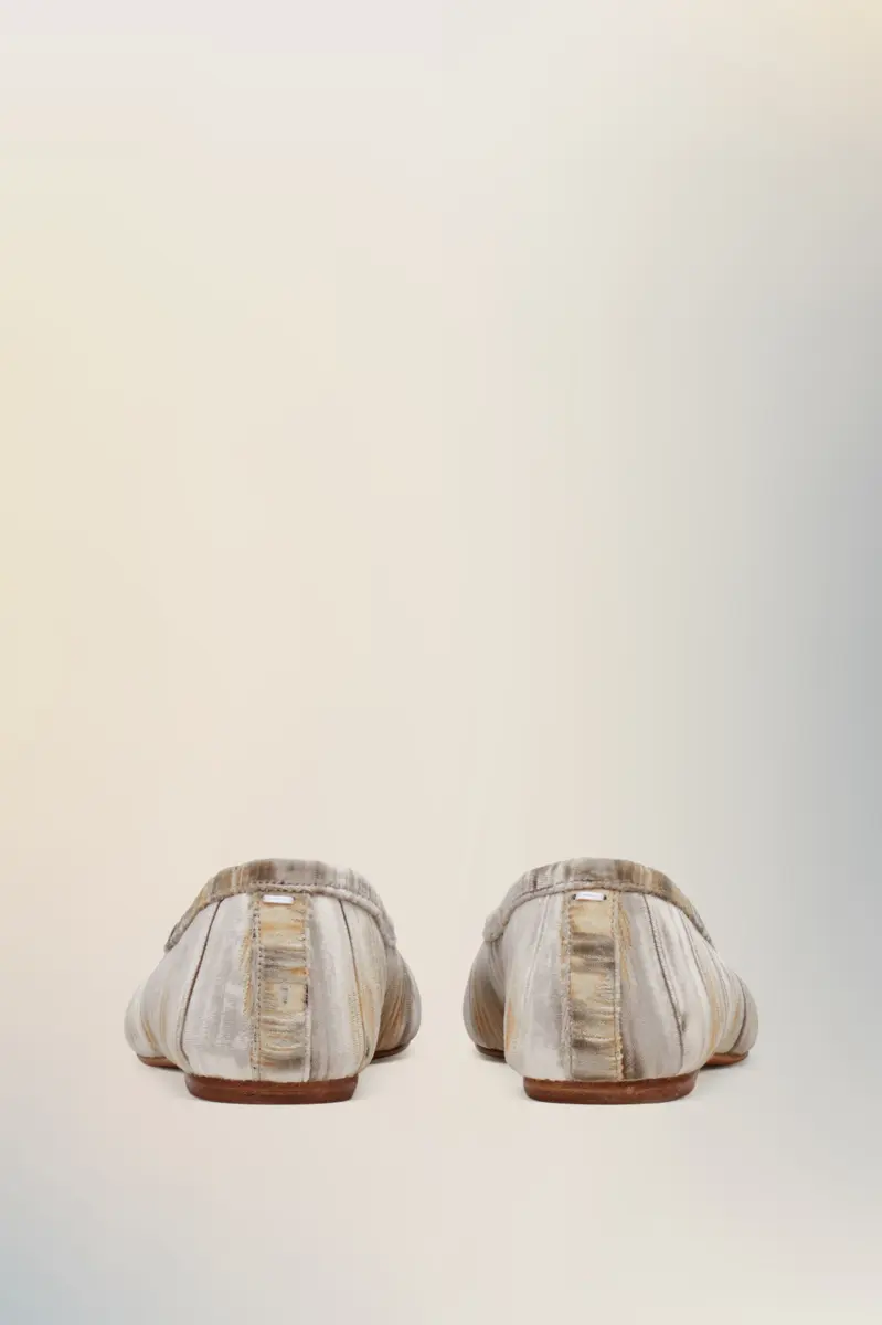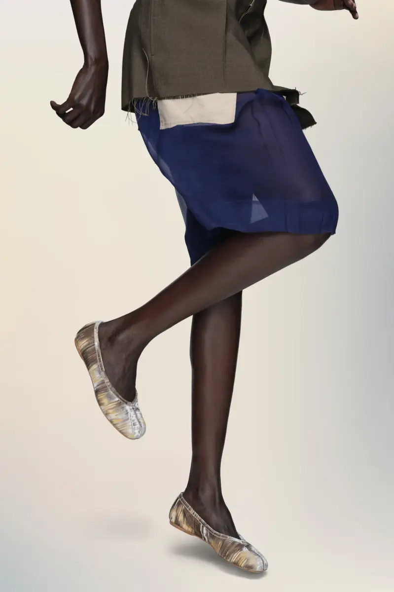 The Tabi ballerina is crafted in pleated velvet, laser-treated and hand distressed evoke the passage of time. The result is a textured patina – one that speaks of memory, motion, and craft. A supple ovine lining and sleek leather sole provide tactile contrast to the sculptural upper. They feature the Tabi split-toe, inspired by the traditional 15th century Japanese sock bearing the same name – launched for the Maison’s debut collection in 1989. It captures the avant-garde and insubordinate spirit of the Maison and exists as a heritage classic, continually explored through each collection. Maison Margiela’s signature single white stitch appears at the back.