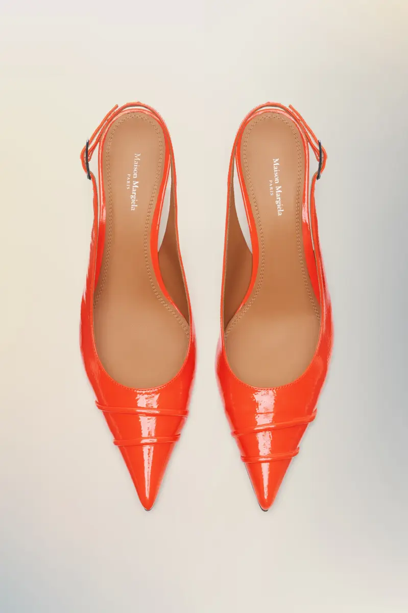 Maison’s Kinkies slingbacks offer a new ladylike shoe silhouette. Crafted from soft patent leather, the shoes feature handmade pleats referencing the ‘memory-of’ gesture, alluding to a pre-loved movement. They are reinforced with rubber at the toe for longevity, and are finished on a 5.5 cm heel. Maison Margiela’s signature stitch appears at the back.