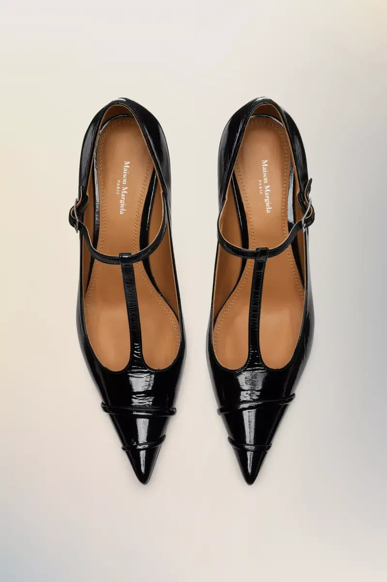 The ladylike form of the Kinkies T-bar is crafted from patent lambskin with a swollen texture and hand-pleated detailing at the toe. The slim heel and strap offer a sense of structure, while a rubber insert at the toe ensures longevity. A classic silhouette with punk attitude. Maison Margiela’s signature single white stitch appears at the back.
