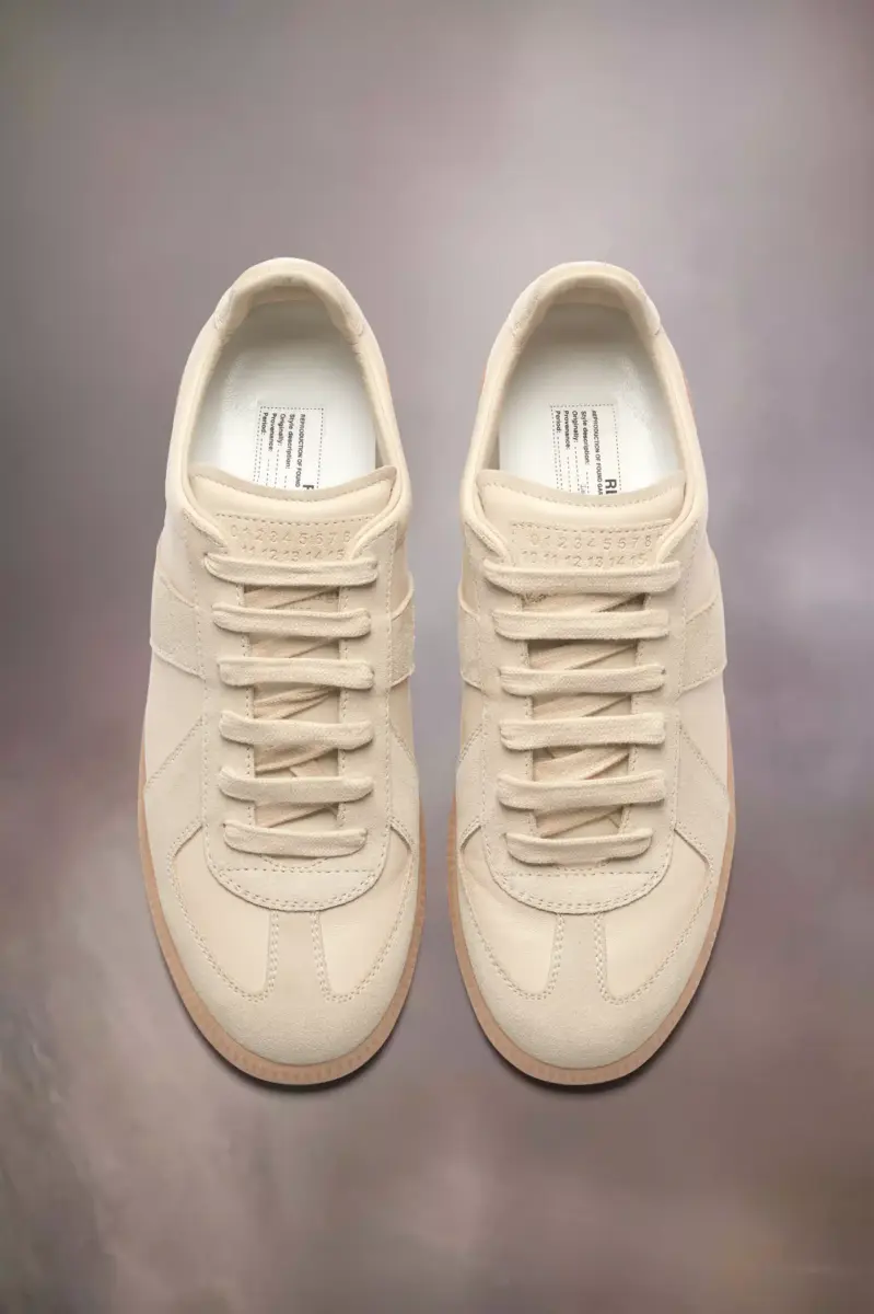 The Replica sneakers in nappa leather and suede with a honey sole. The Maison’s iconic Replica sneakers are inspired by Austrian sports shoes from the seventies. Details on the Replica pairs are continually reworked in line with the season’s inspirations.