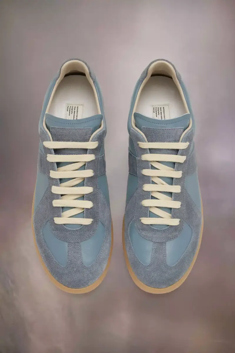 The Replica sneakers in nappa leather and suede with a honey sole. The Maison’s iconic Replica sneakers are inspired by Austrian sports shoes from the seventies. Details on the Replica pairs are continually reworked in line with the season’s inspirations.