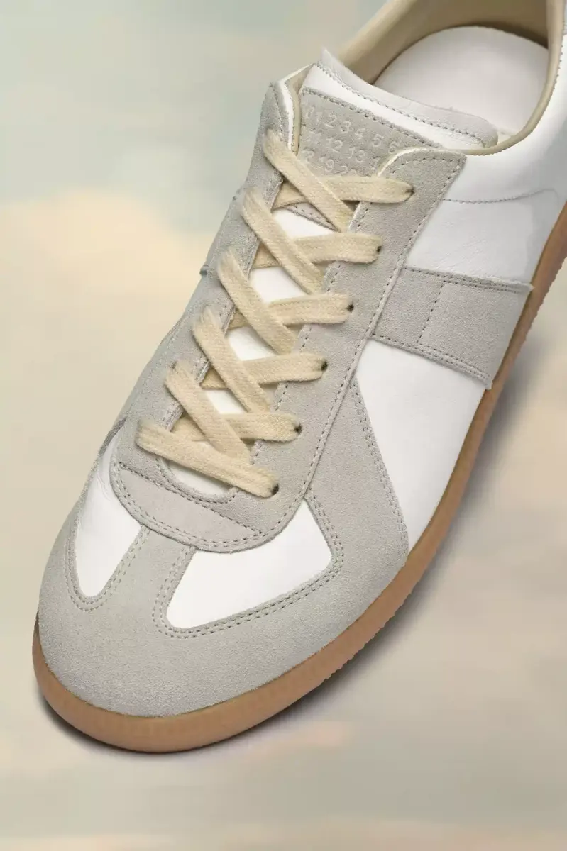 The Replica sneakers in nappa leather and suede with a honey sole. The Maison’s iconic Replica sneakers are inspired by Austrian sports shoes from the seventies. Details on the Replica pairs are continually reworked in line with the season’s inspirations.